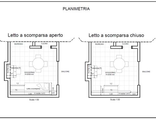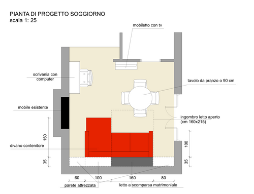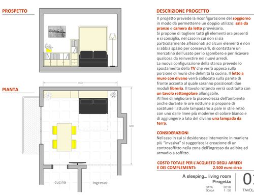 Buongiorno a tutti, vorrei rinnovare il soggiorno del bilocale di mio padre, in modo da renderlo trasformabile alla sera nella mia stanza da letto. Attualmente c'è un piccolo divano letto, ma vorrei un progetto che comprendesse un letto a scomparsa. Vorrei una soluzione abbastanza economica, essendo una soluzione che non deve durare in eterno (intendo per me di dormire qui), ma che comunque in futuro possa essere una soluzione per ospitare eventualmente una persona (fosse anche una badante). L'ideale sarebbe che la trasformazione fosse facilissima e quasi istantanea. Grazie in anticipo a tutti coloro che vorranno partecipare.