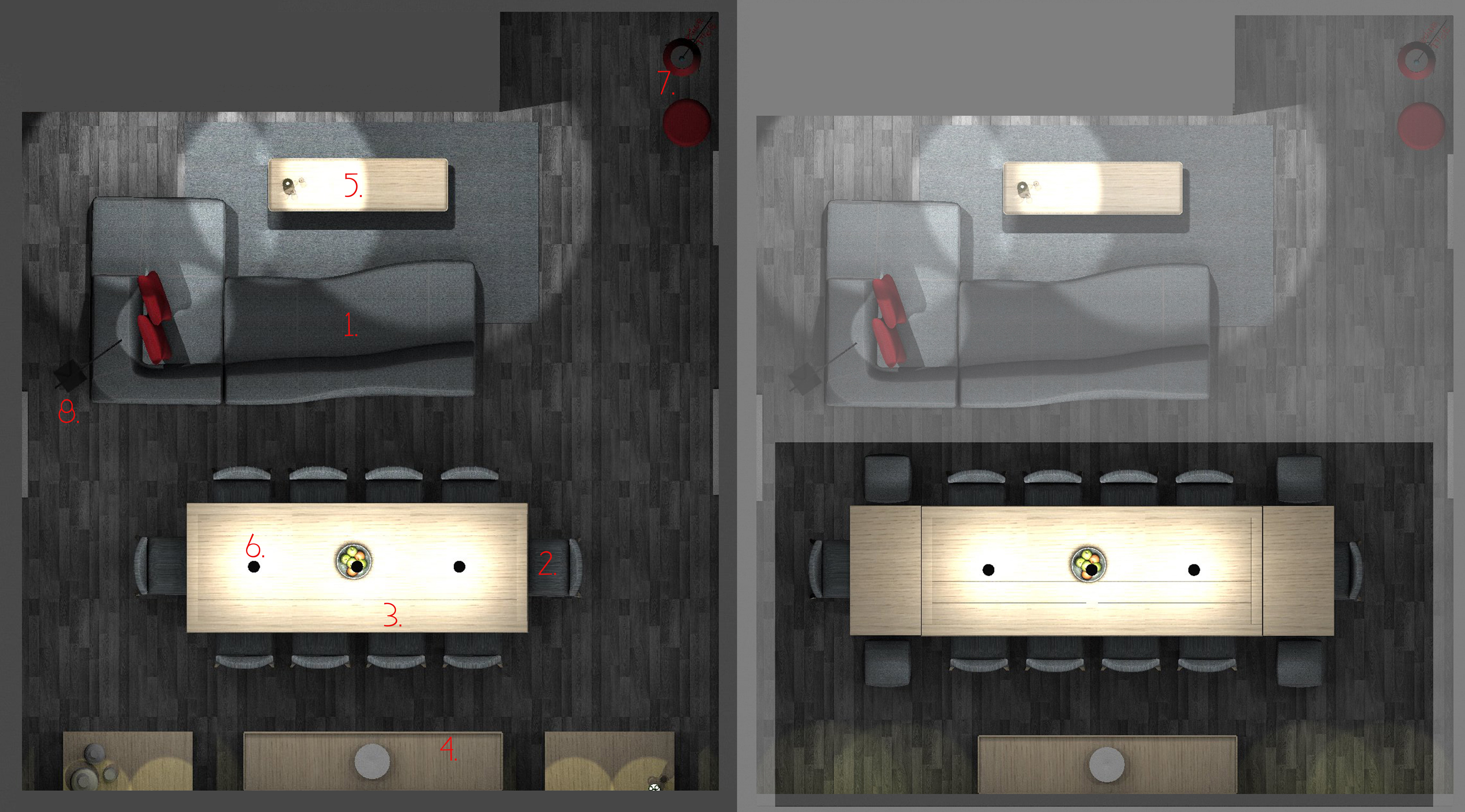 Pertanto quello che vorremmo ottenere essendo i mq molto generosi è un'area dove è possibile guardare la TV e chiacchierare sia con la famiglia che con gli amici utilizzando come illuminazione faretti al massimo se necessaria luce, altrimenti più bassi o di minor quantità accesi se vorremo ricreare un'atmosfera più calda/soft per godersi il camino e magari un cognac.