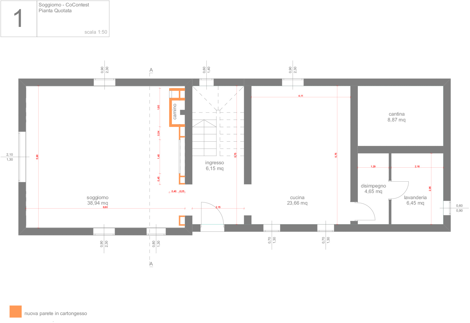 La finestra, contrariamente alla piantina, più vicina al camino è stata fatta murare per lasciare maggiore spazio ed importanza al camino che non abbiamo ancora deciso venga messo all'angolo oppure in piano sulla parete, considerando però che dovrà rimanere non oltre mezzo metro per un buon tiraggio. (il camino/focolare è stato scelto e sarà un Piazzetta mod.MA 261 SL).