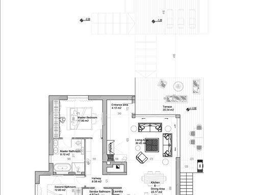 The covered veranda has an area of about 45sqm, that we would like, with an appropriate closure with sliding or folding windows, use as a living area with fireplace.