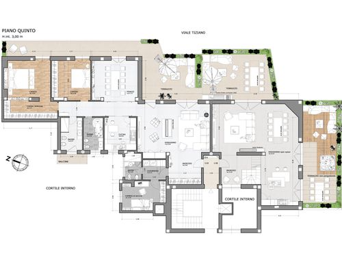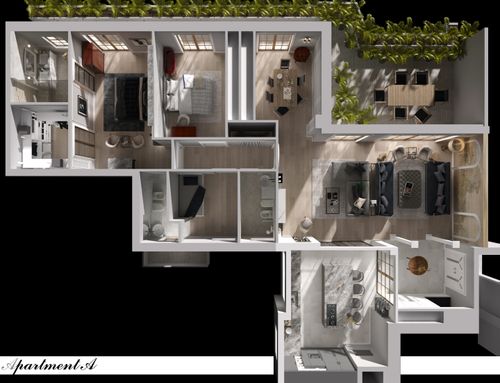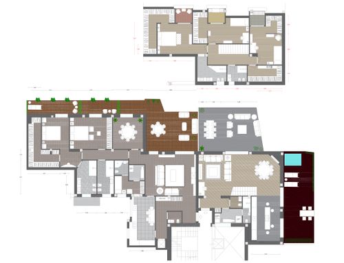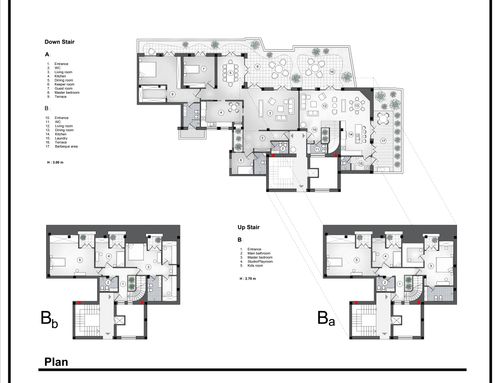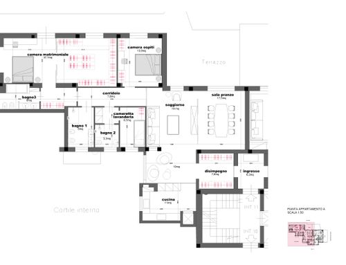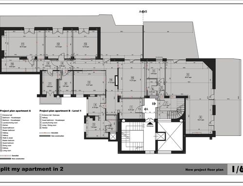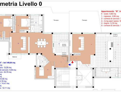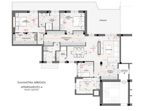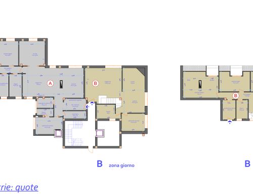 Dividere l'appartamento in due appartamenti distinti, a destra zona A su un piano con due camere da letto due bagni cucina con cameretta e bagno di servizio, sala da pranzo separata il piĂą possibile e salone.