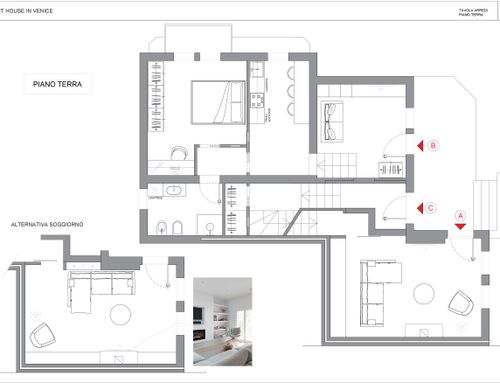 En el ático hoy hay un dormitorio y donde está escrito el compartimento técnico hay un pequeño baño para restaurar.