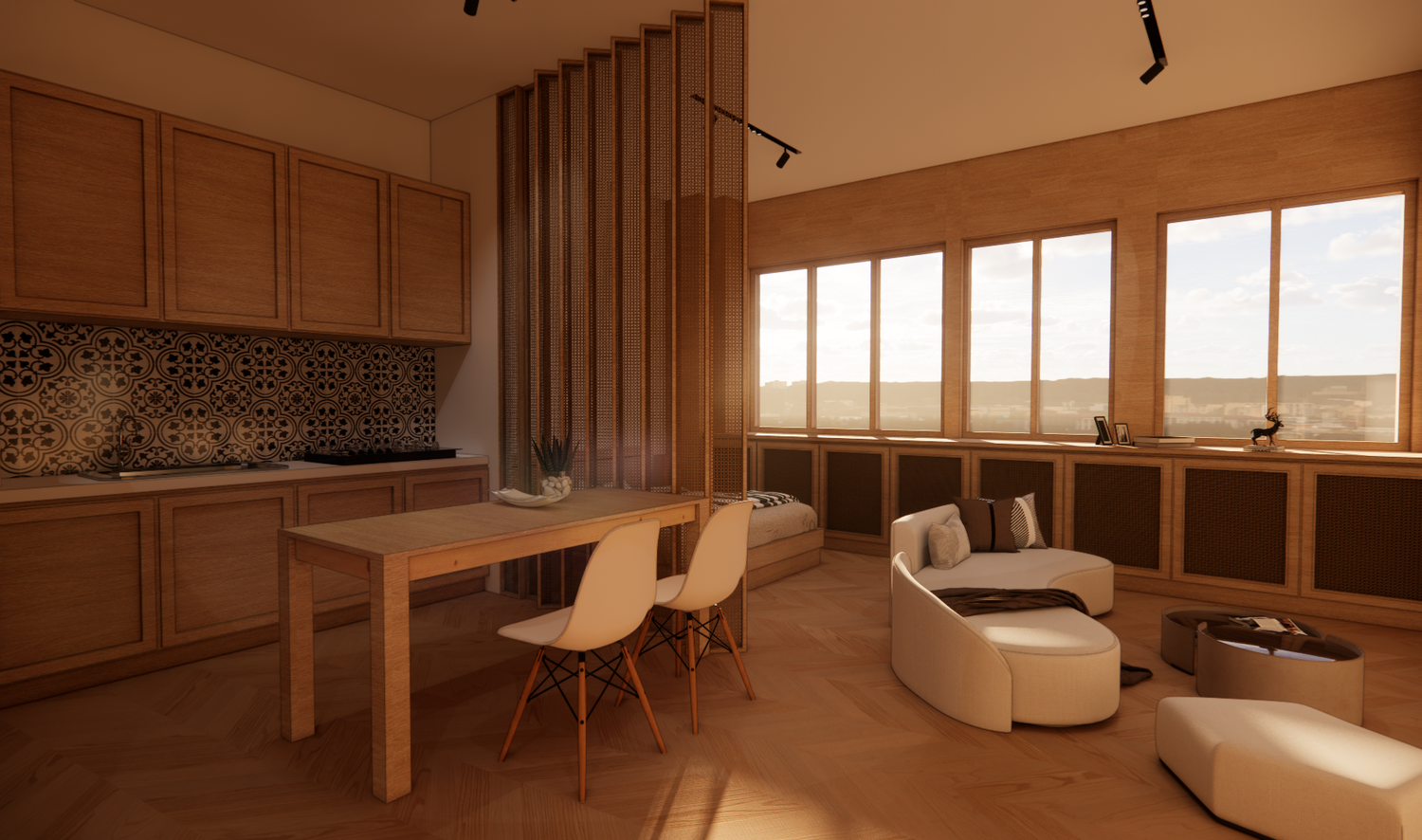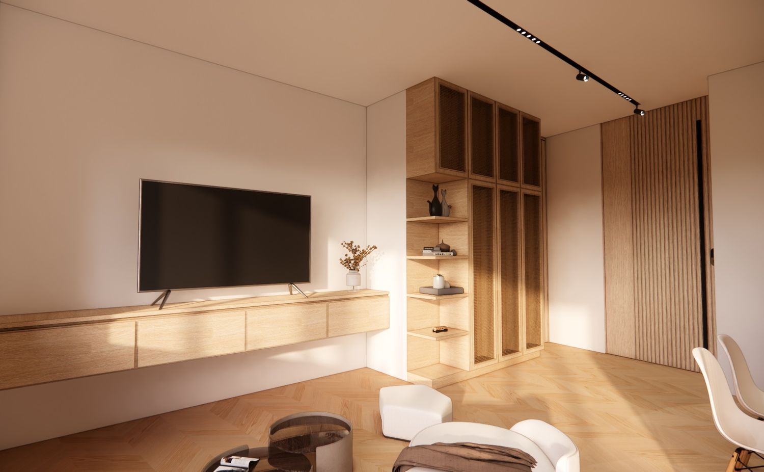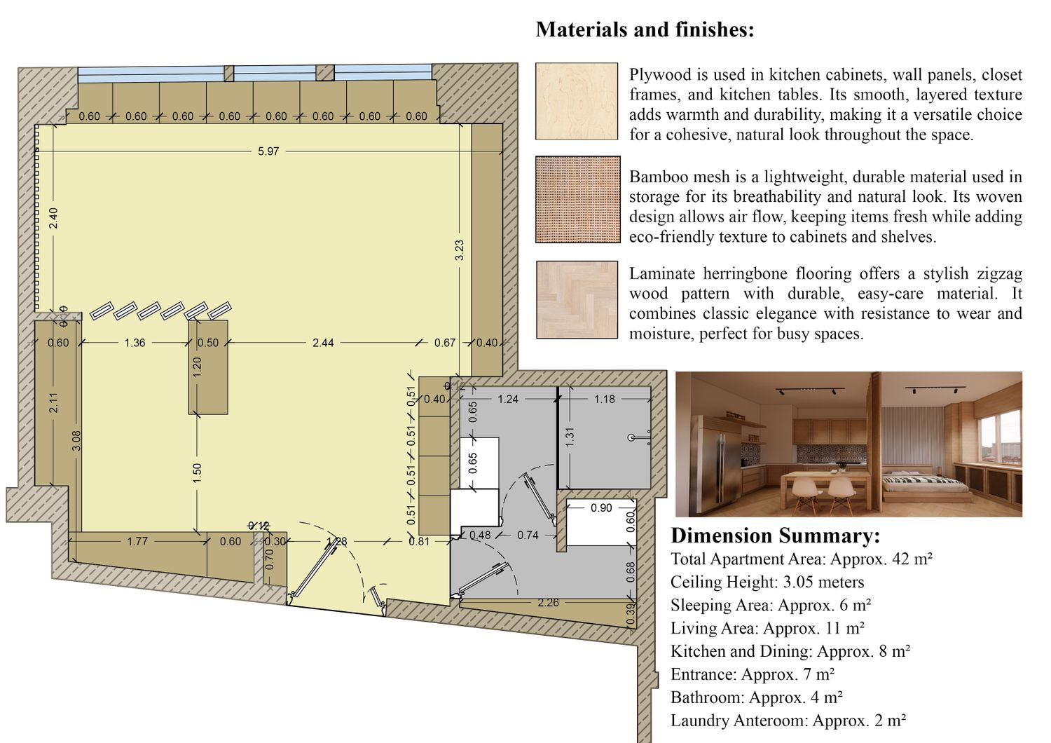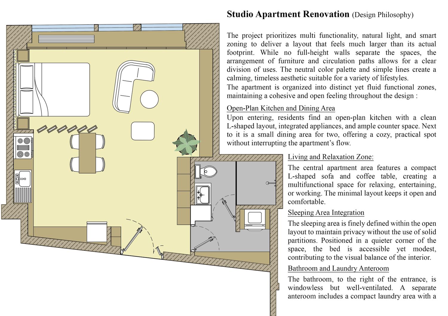 This project transforms a compact studio apartment into a modern, multifunctional living space designed for comfort and efficiency. The layout embraces an open-plan concept, integrating the kitchen, dining, sleeping, and living areas, while maintaining clear spatial organization.