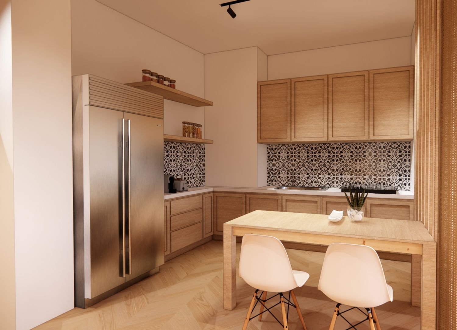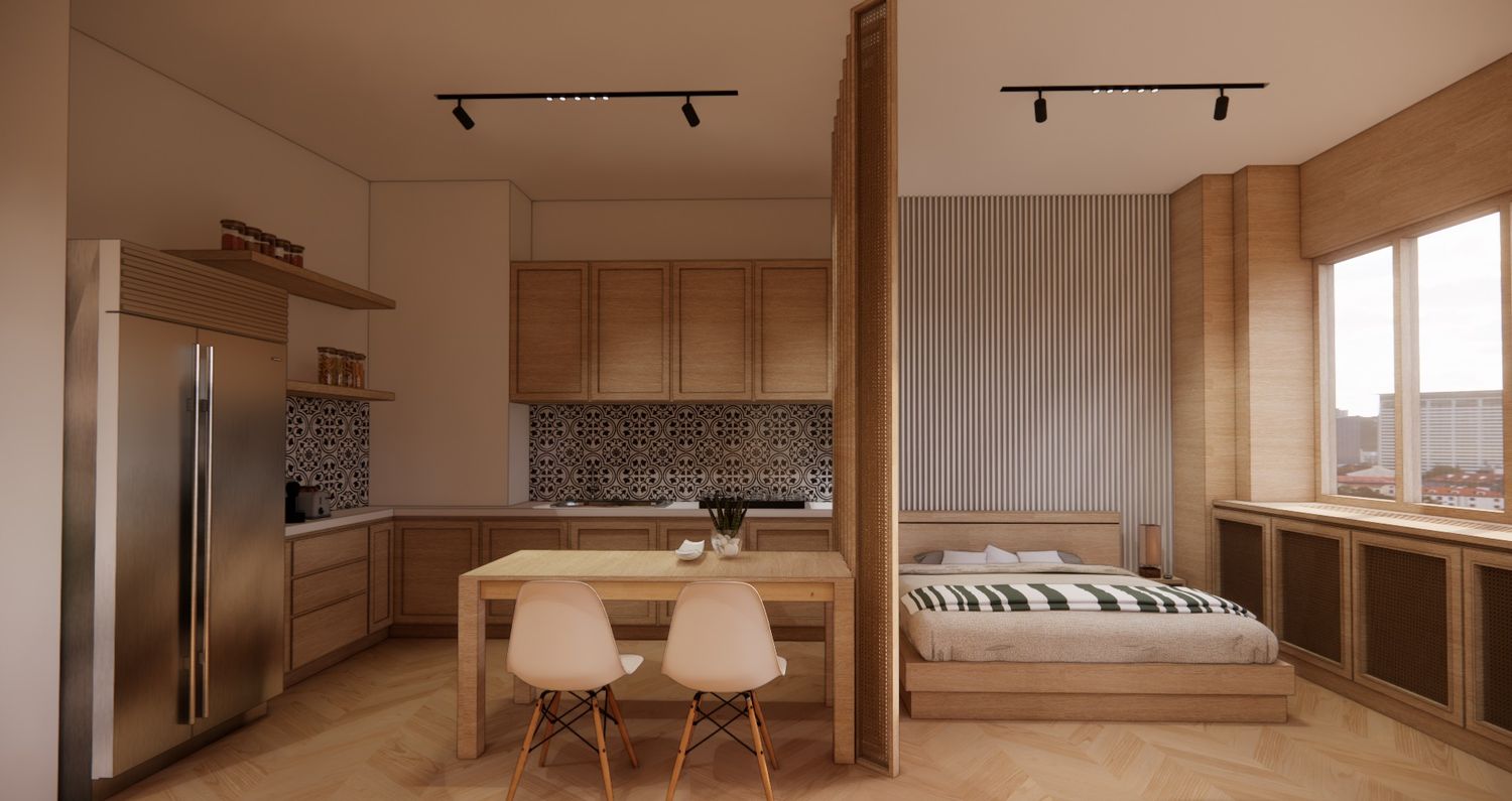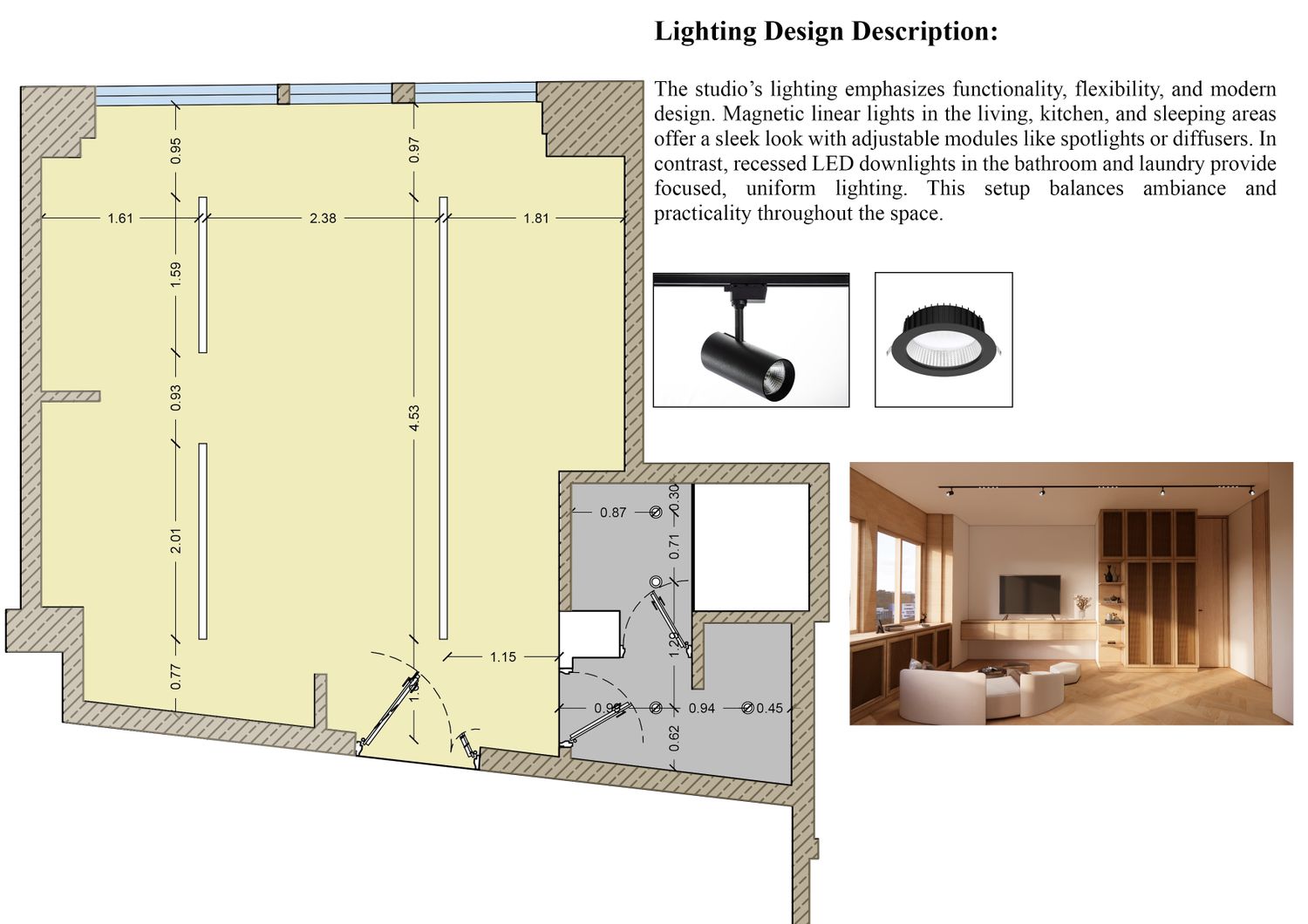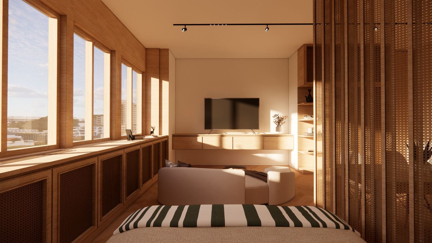 This project transforms a compact studio apartment into a modern, multifunctional living space designed for comfort and efficiency. The layout embraces an open-plan concept, integrating the kitchen, dining, sleeping, and living areas, while maintaining clear spatial organization.