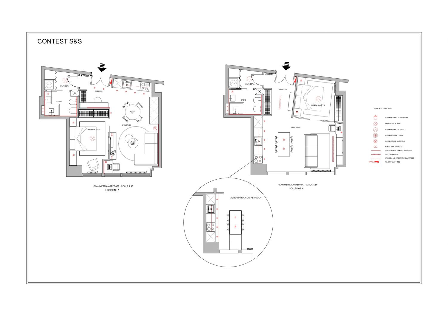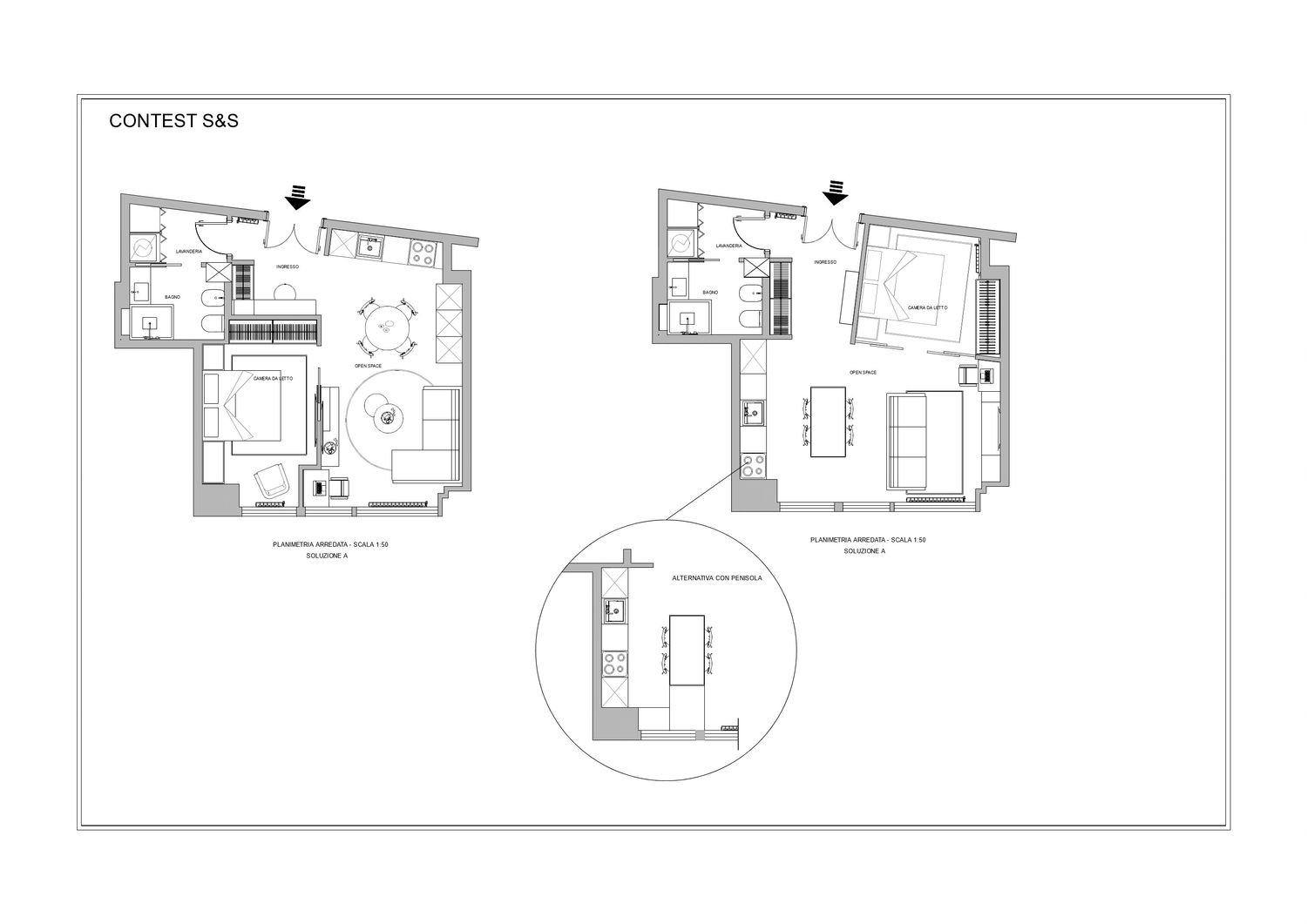 Il progetto riguarda la la ristrutturazione di un monolocale , per il quale ho sviluppato due diverse ipotesi di layout, tenendo conto delle richieste.