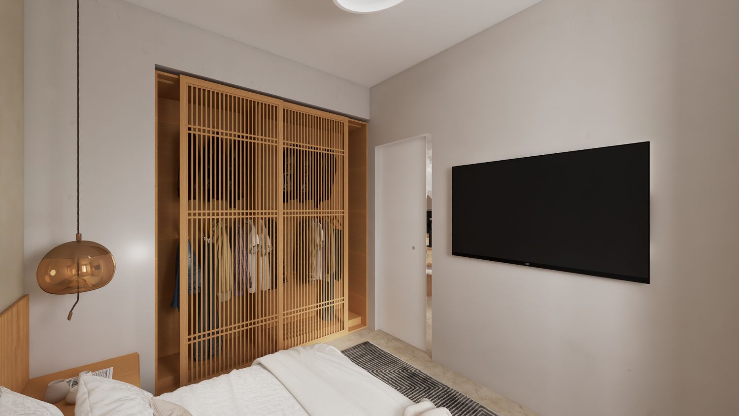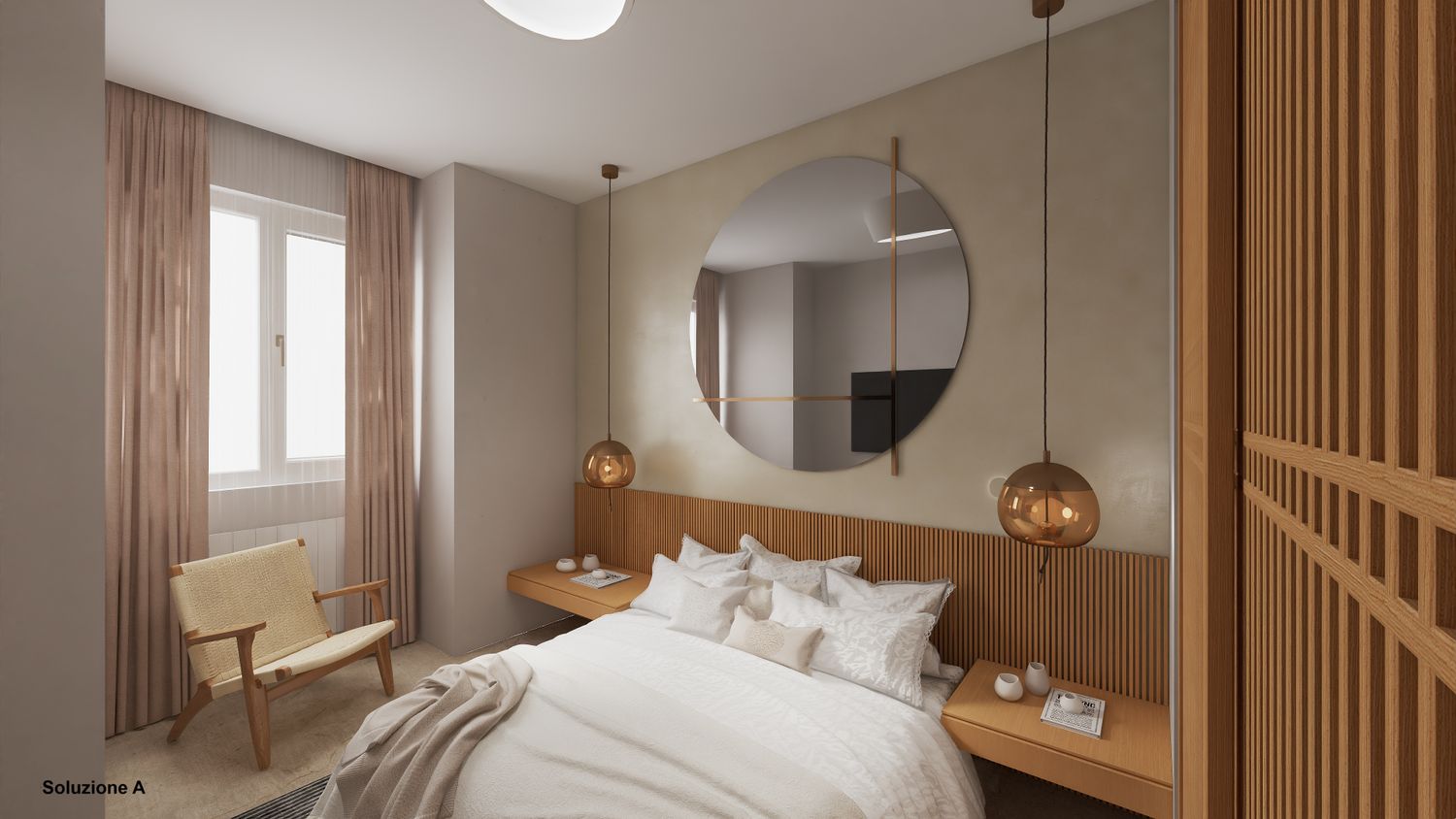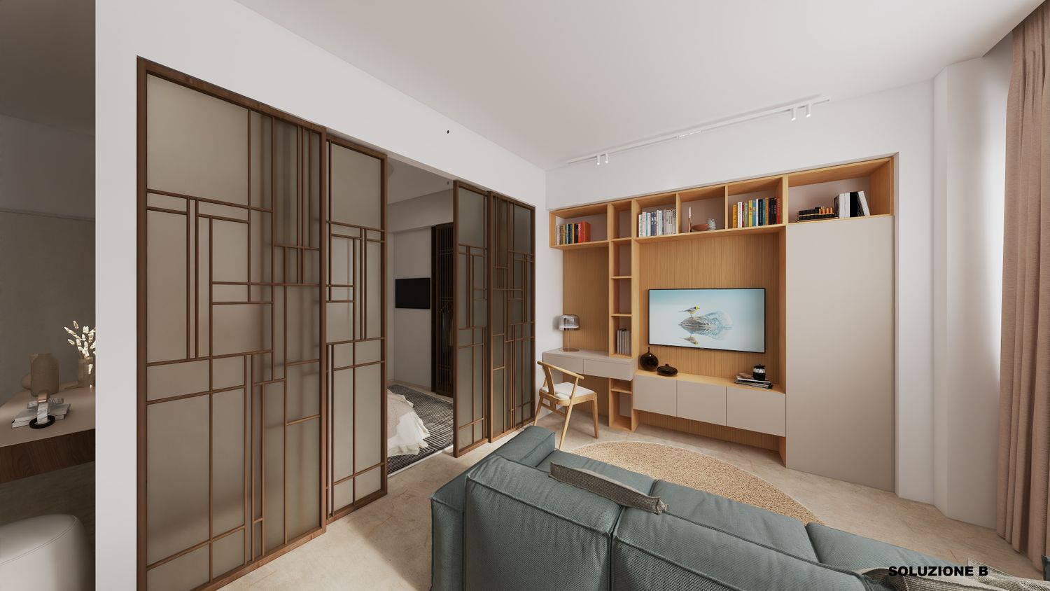 2-La camera da letto realizzata all’interno dell’open space è separata da una porta scorrevole (ipotizzate porte scorrevoli Rimadesio).