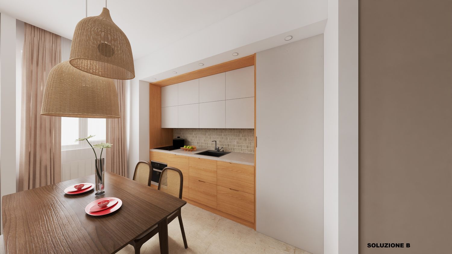 3-un angolo cottura in linea completo di tutti gli elettrodomestici necessari con tavolo rettangolare 160x80 allungabile. Nei disegni è stata ipotizzata anche una soluzione con penisola ma date le dimensioni dell’appartamento ho preferito dare priorità al tavolo in quanto più flessibile.