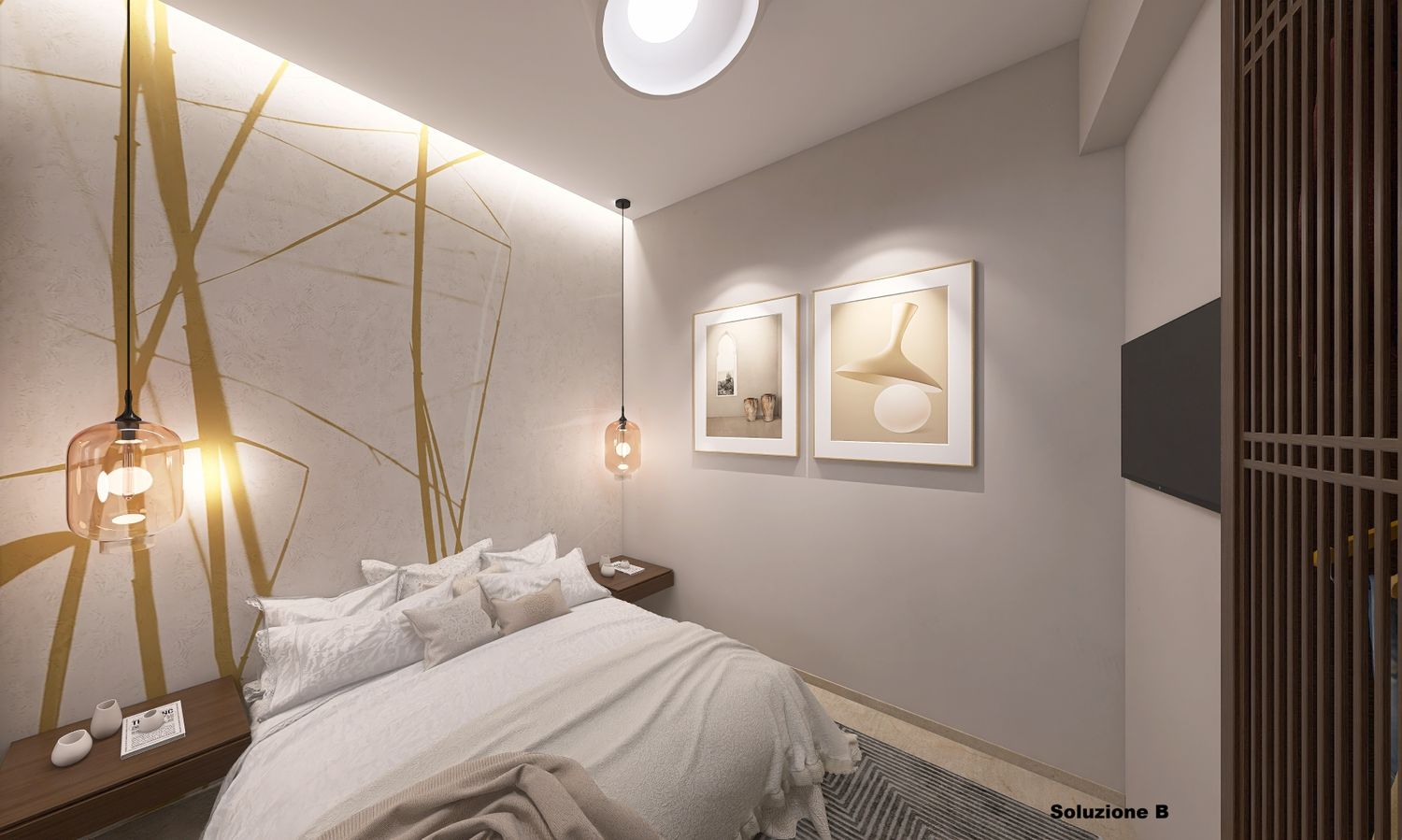 la distribuzione prevede la realizzazione della camera da letto di circa 10 mq separata dalla zona open space. La metratura è ridotta ( da regolamento edilizio risulta essere una singola) ma sufficiente per inserire un armadio di 2 metri, un letto 160x200 e una piccola poltroncina.