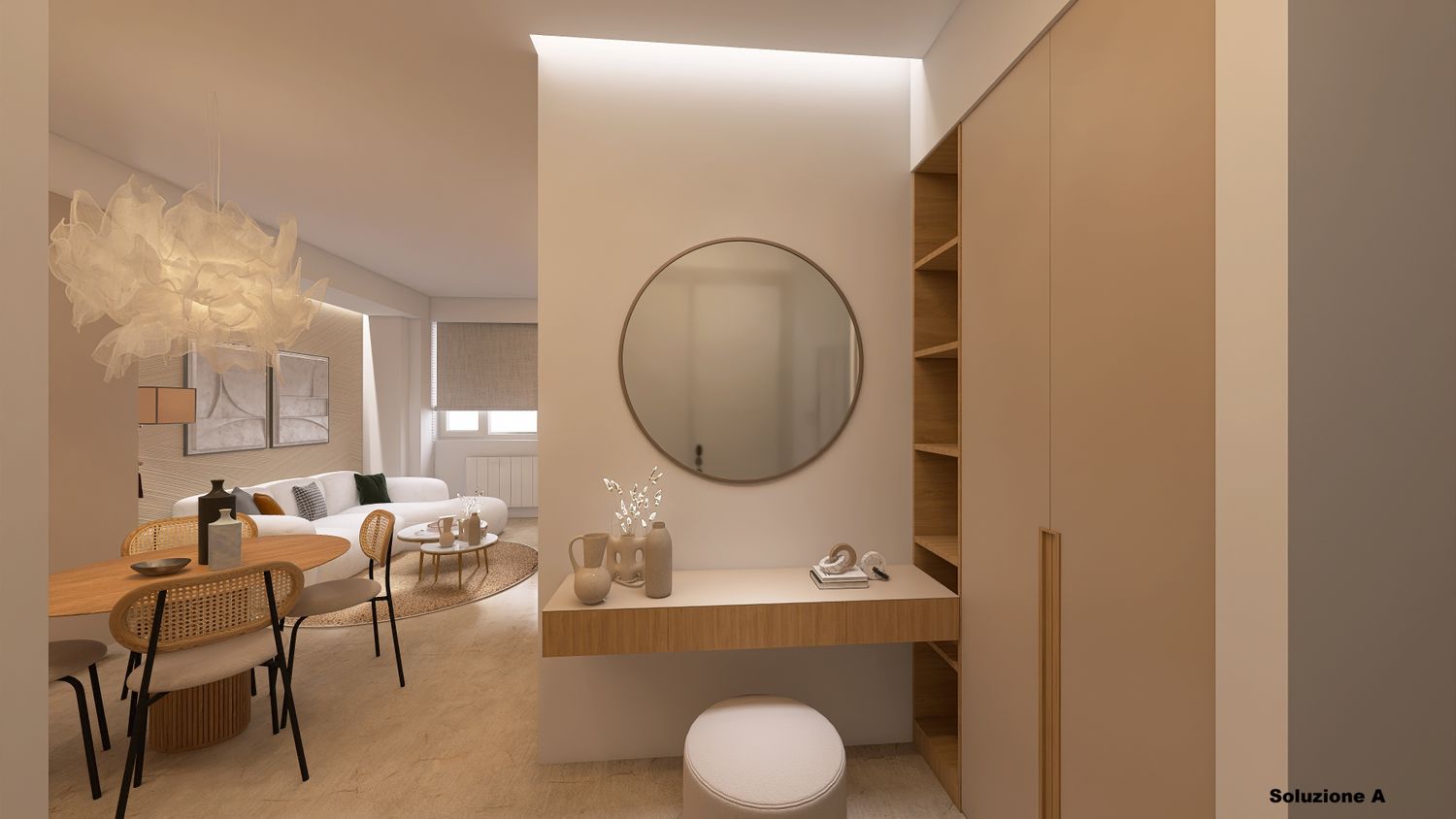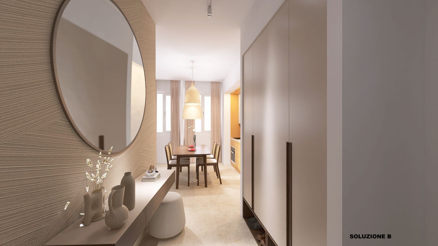 1- Ingresso con consolle e un armadio capiente dato che quello della camera è più piccolo rispetto alla soluzione precedente