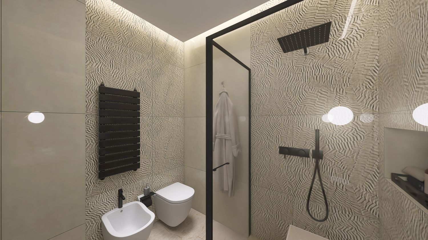 Il bagno piccolo, ma accogliente, è dotato di mobile lavabo di dimensioni 80 x 48, doccia 80x100 e coppia di sanitari. I rivestimenti scelti sono della Fap Ceramiche linea Bloom.