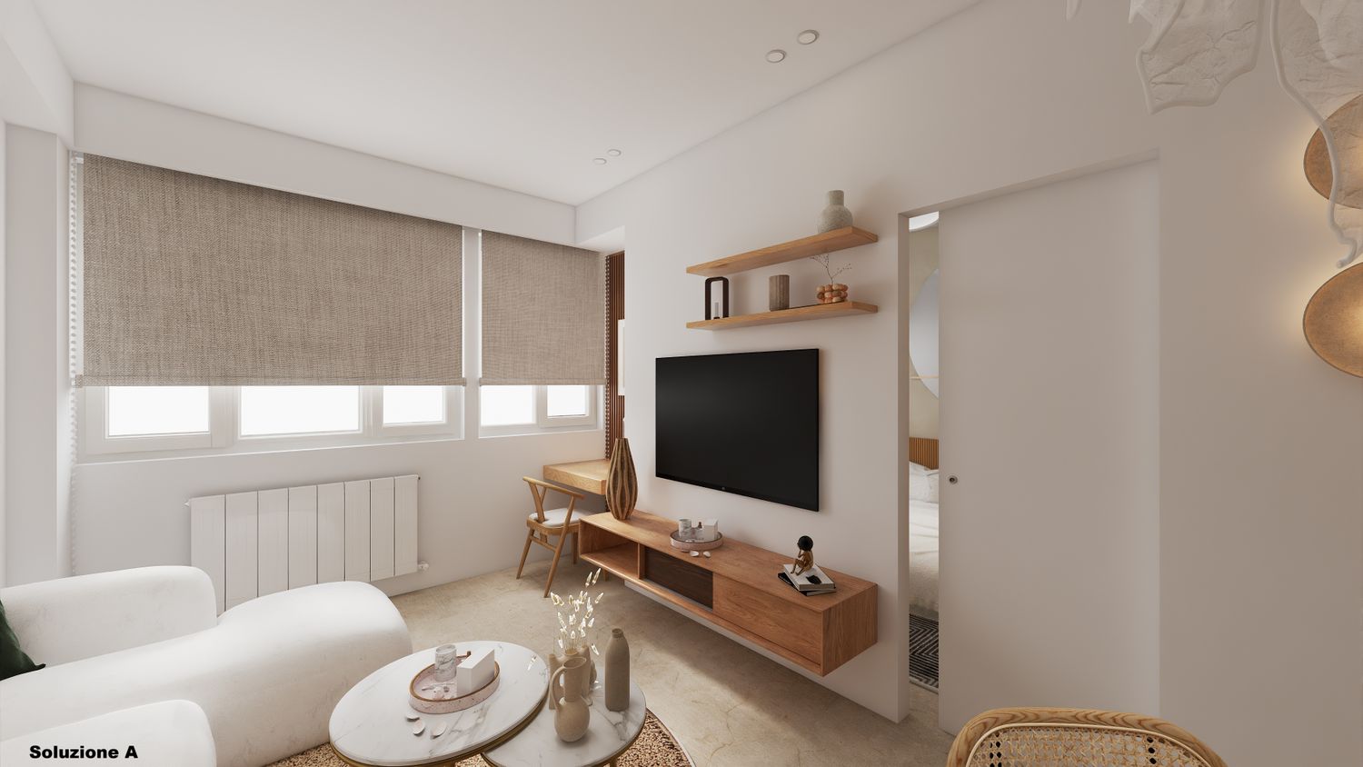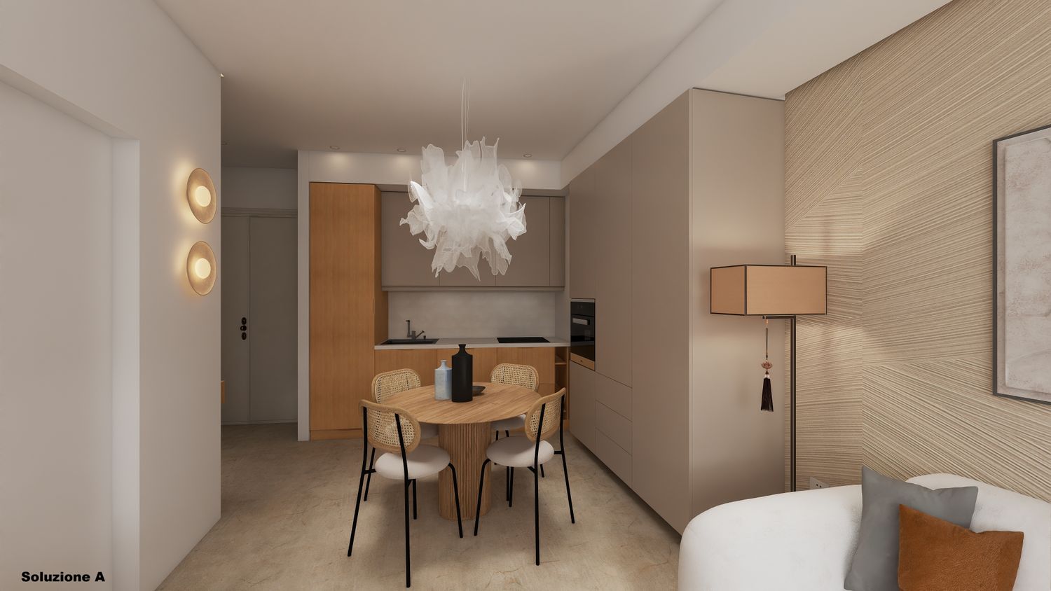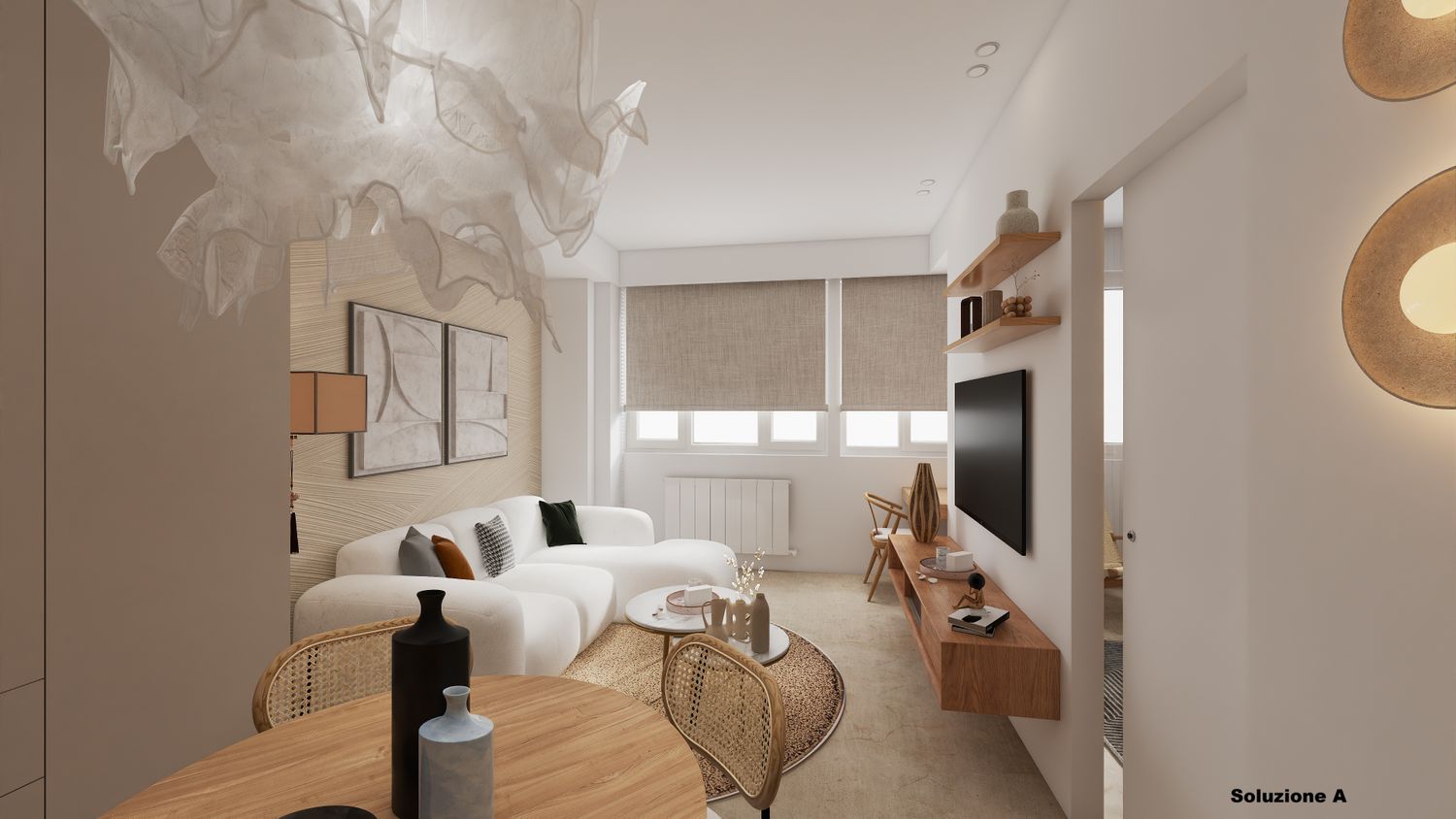 Le pareti sono prevalentemente bianche con accento solo su una parete. Nella prima soluzione dietro la parete del salotto e nella seconda sulla parete dell’ingresso. Per entrambe è stata ipotizzata una carta da parati Atelier Berger.