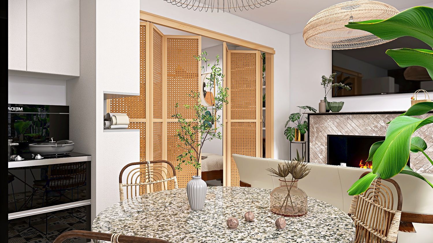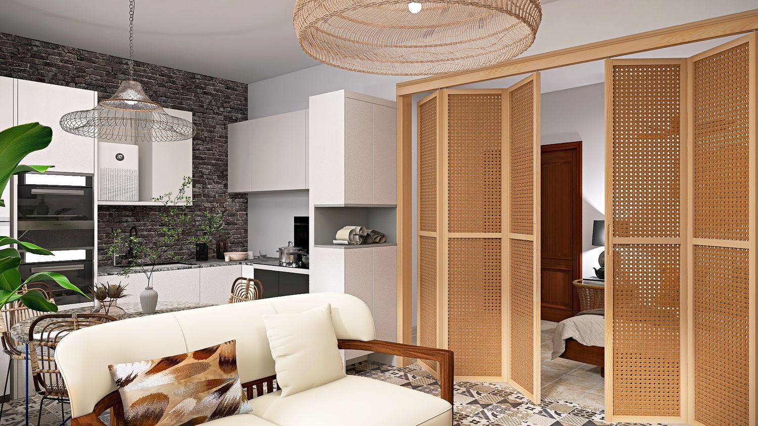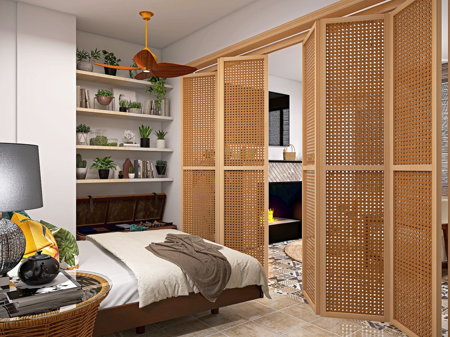 Hi client, this is a very challenging studio space to design, considering you want an open space with few windows. The concept is to create transparent folding doors made of rattan or woven bamboo so they can be opened and closed as desired. The only closed areas are the bathroom and walk-in closet with a door. This design incorporates a maximalist concept. I hope you enjoy it. Thank you.