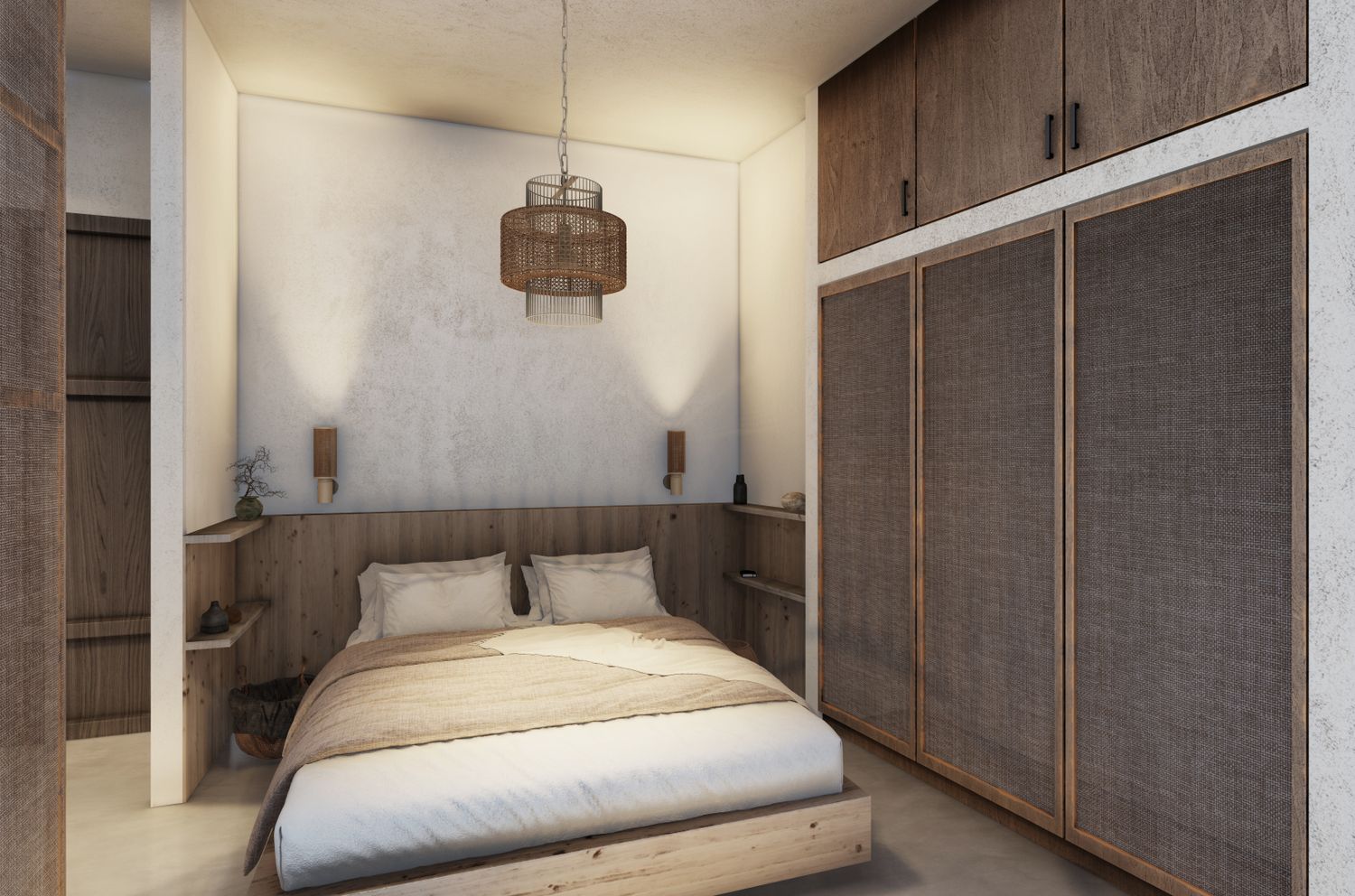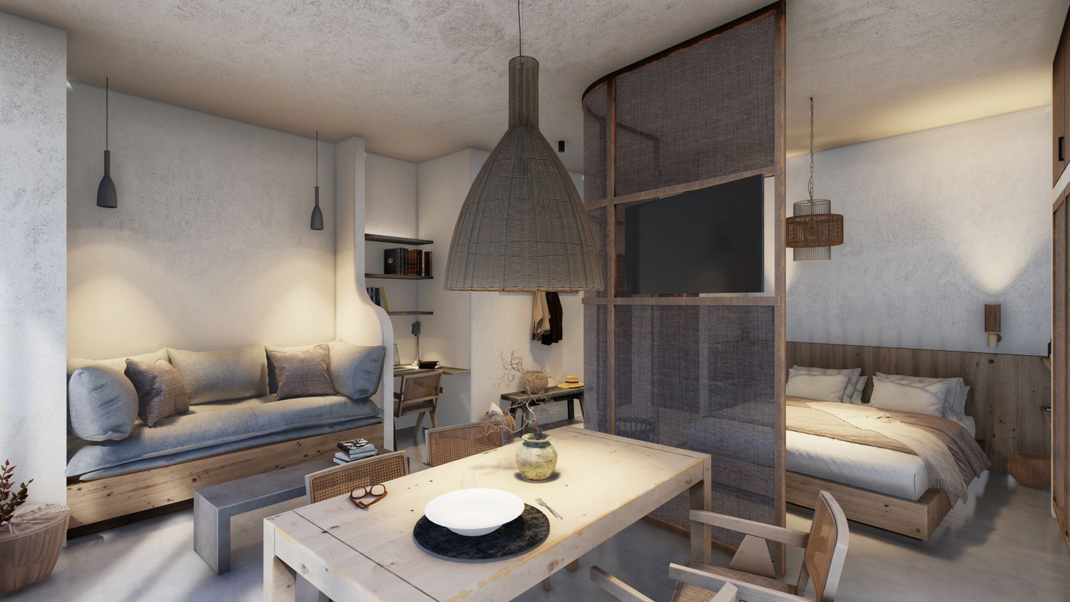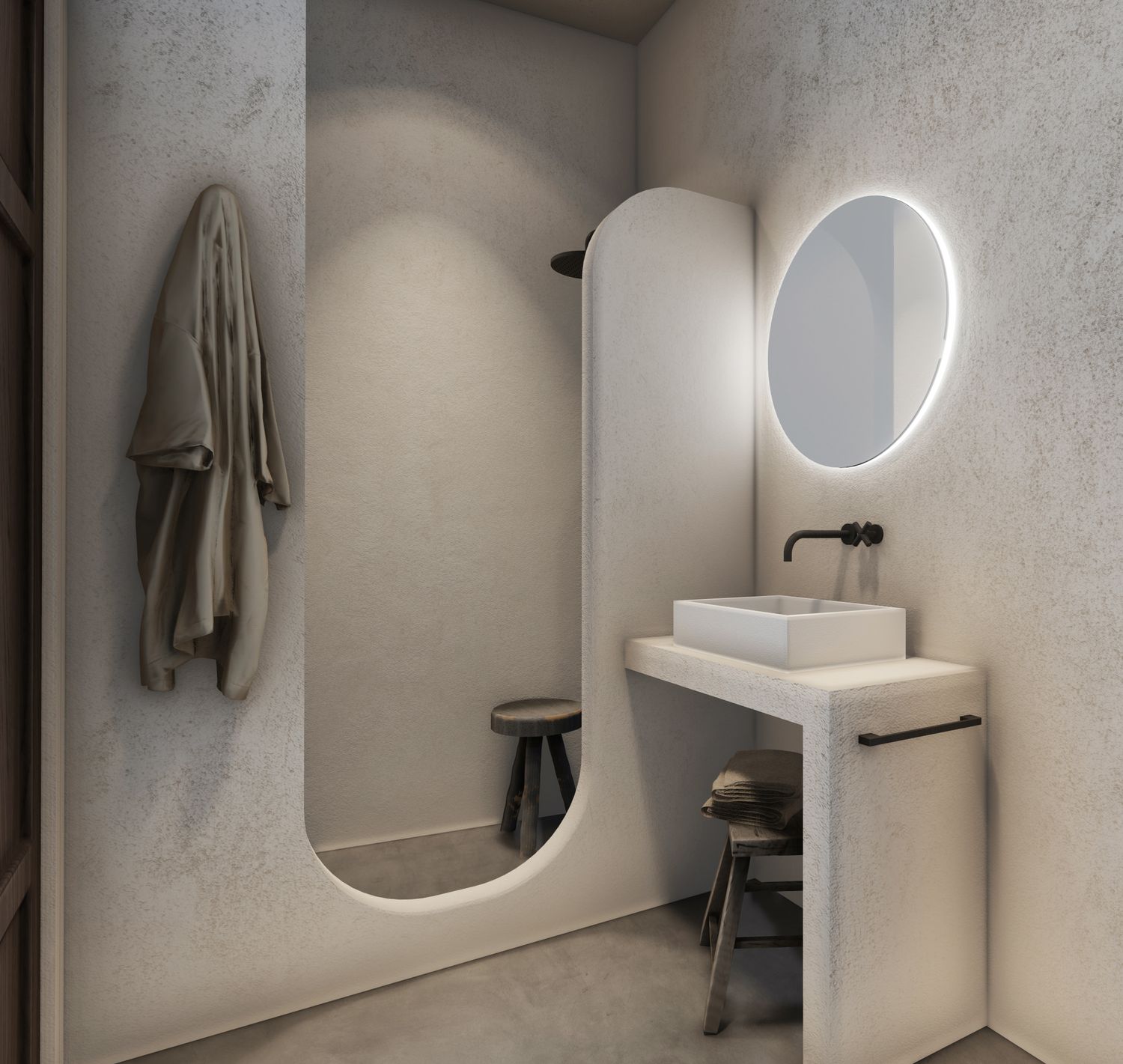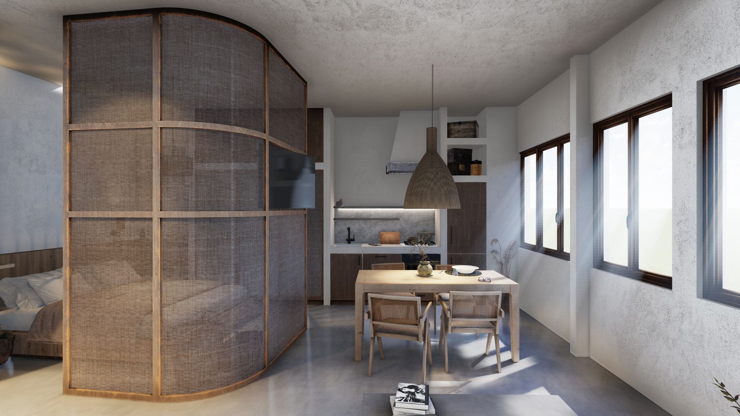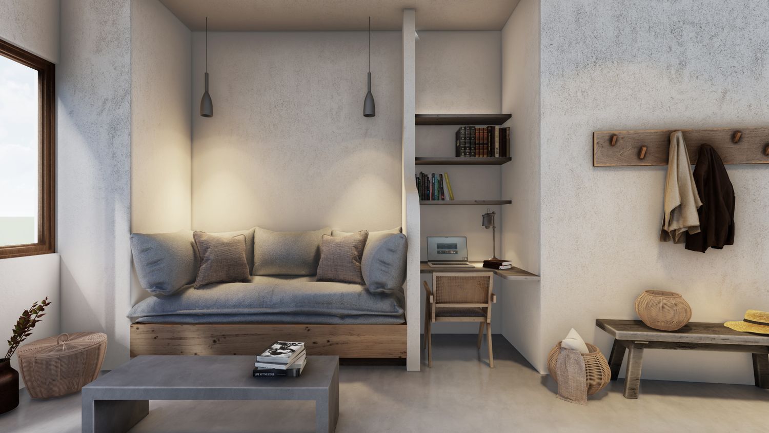 Per la pavimentazione viene proposta una resina dai toni neutri, così come per le pareti intonacate a grezzo, pensate sui toni del bianco sporco. Gli arredi sono principalmente in legno, in modo tale da unire visivamente gli ambienti e dare un effetto accogliente, caldo e coeso agli spazi.