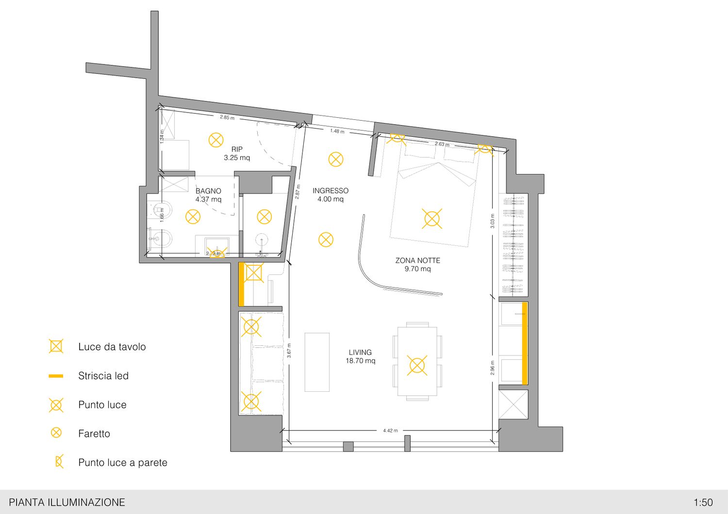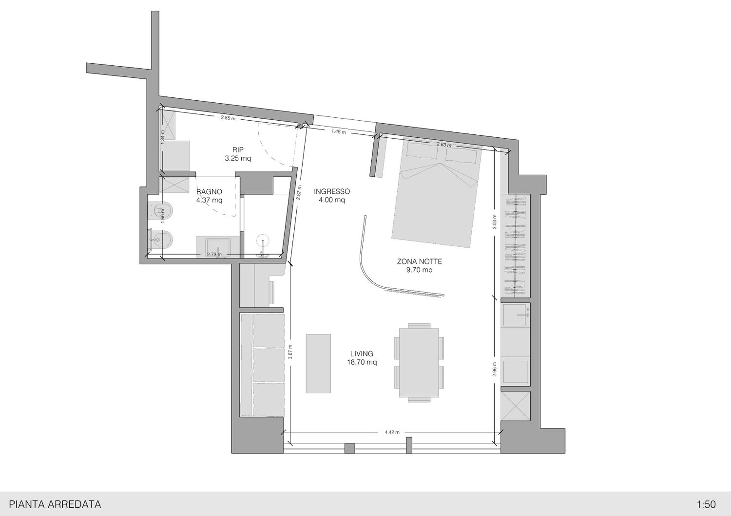 la soluzione che le propongo per la ristrutturazione dell'appartamento consiste in una configurazione spaziale che vuole definire ogni ambiente come elemento a sé, seppur mantenendo un disegno unitario, in cui ogni ambito comunica con gli altri. Dall'ingresso, subito a destra troviamo un ripostiglio-lavanderia, il quale dà accesso al bagno, dotato di ampia doccia walk-in. A sinistra dell'ingresso si apre la zona notte, separata dalla zona giorno tramite un sistema intelaiato in legno, tamponato da un tessuto con ampia trama, così da offrire un effetto vedo-non vedo e separare gli ambienti senza però dare una netta separazione. In tale struttura a telaio è posta la televisione, la quale, attraverso un perno, può ruotare e servire sia la zona giorno che la zona notte. Antistante l'area living, a destra, si è ricavato un piccolo spazio con scrivania, adatto allo studio. Sulla parete opposta, invece, abbiamo un ampio mobile che occupa tutta la lunghezza del muro e che si configura come armadio per la zona notte e poi diventa la cucina.