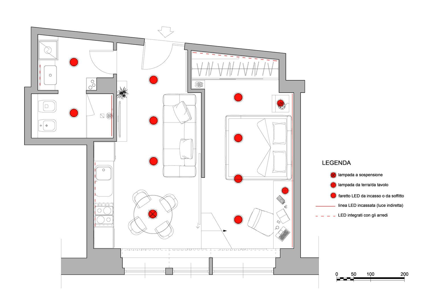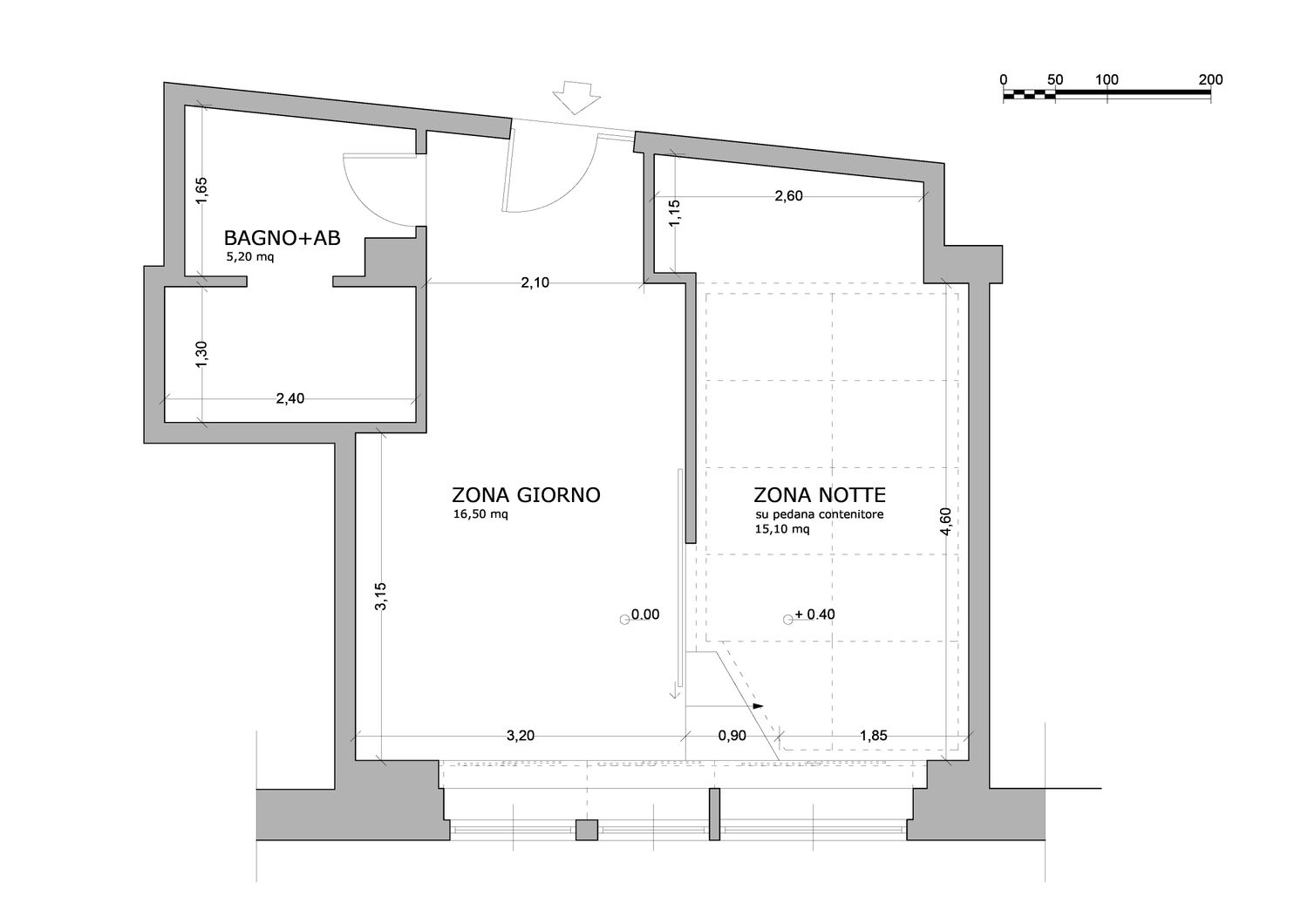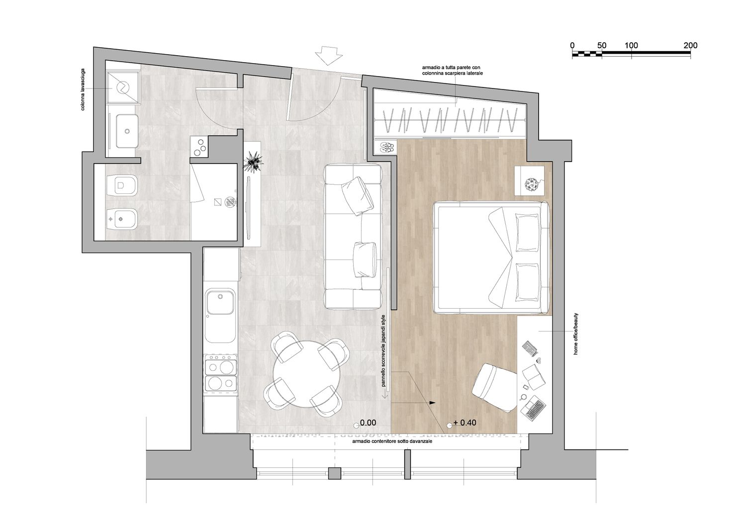 la zona notte è sopraelevata, costruita su una piattaforma in legno con scomparti apribili, in modo da moltiplicare l'area contenitiva dell'appartamento; al suo interno, la zona cieca viene arredata con una canina armadio, mentre quella più vicina alla finestra viene sfruttata per realizzare un piccolo home office/zona beauty;