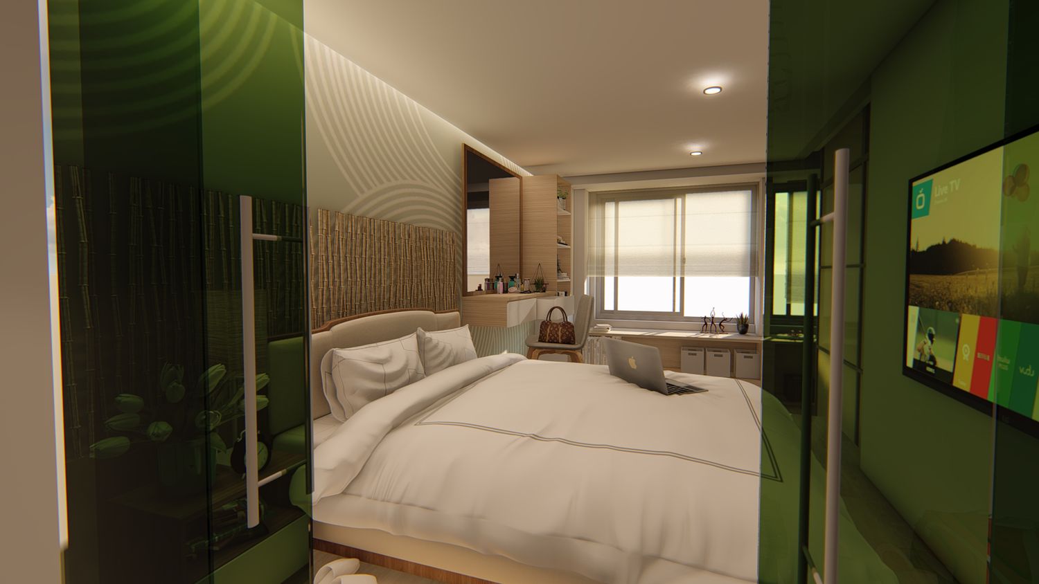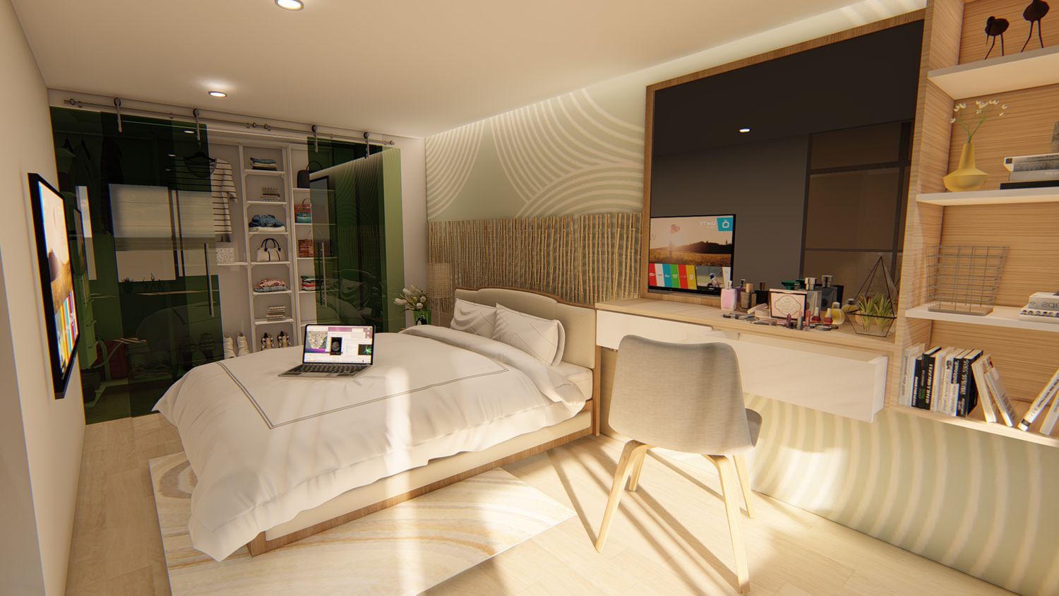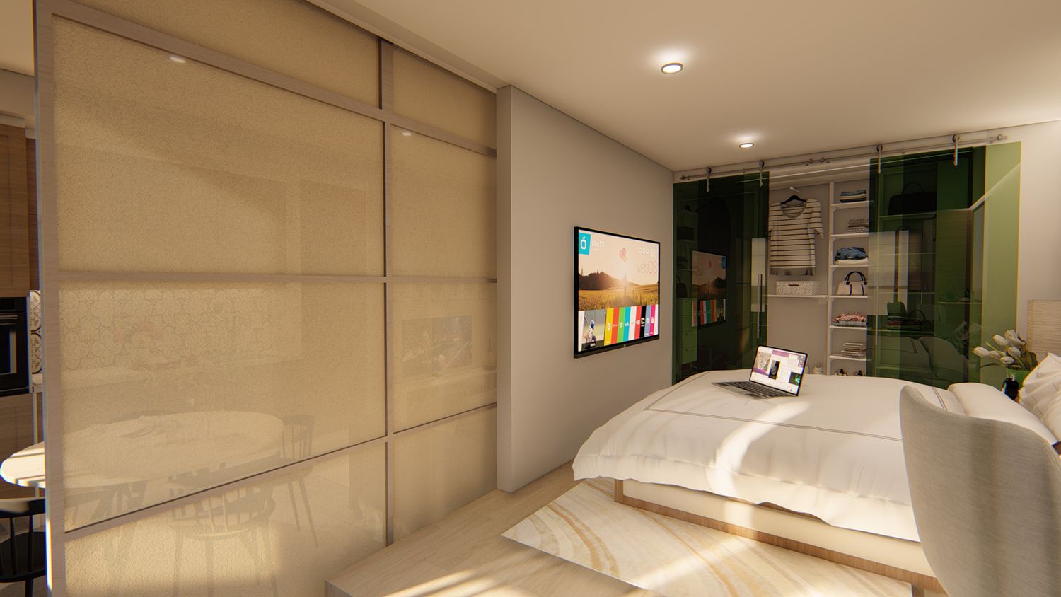 la zona notte è sopraelevata, costruita su una piattaforma in legno con scomparti apribili, in modo da moltiplicare l'area contenitiva dell'appartamento; al suo interno, la zona cieca viene arredata con una canina armadio, mentre quella più vicina alla finestra viene sfruttata per realizzare un piccolo home office/zona beauty;