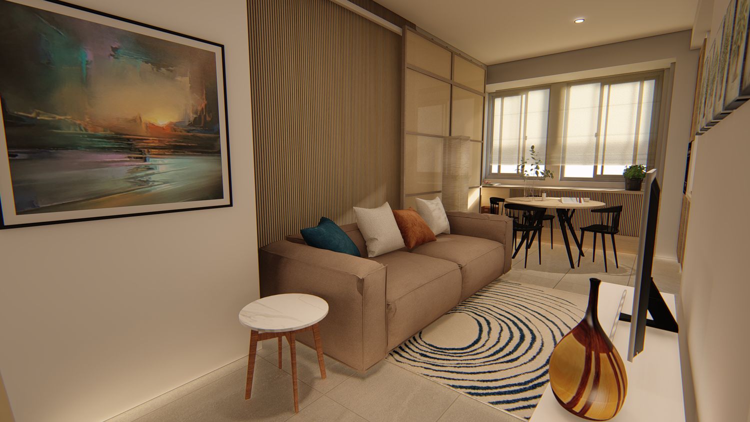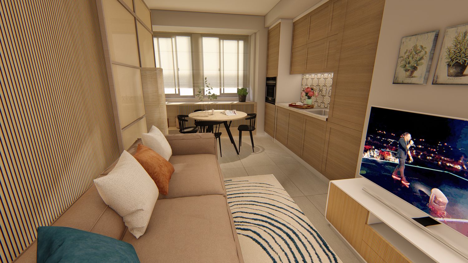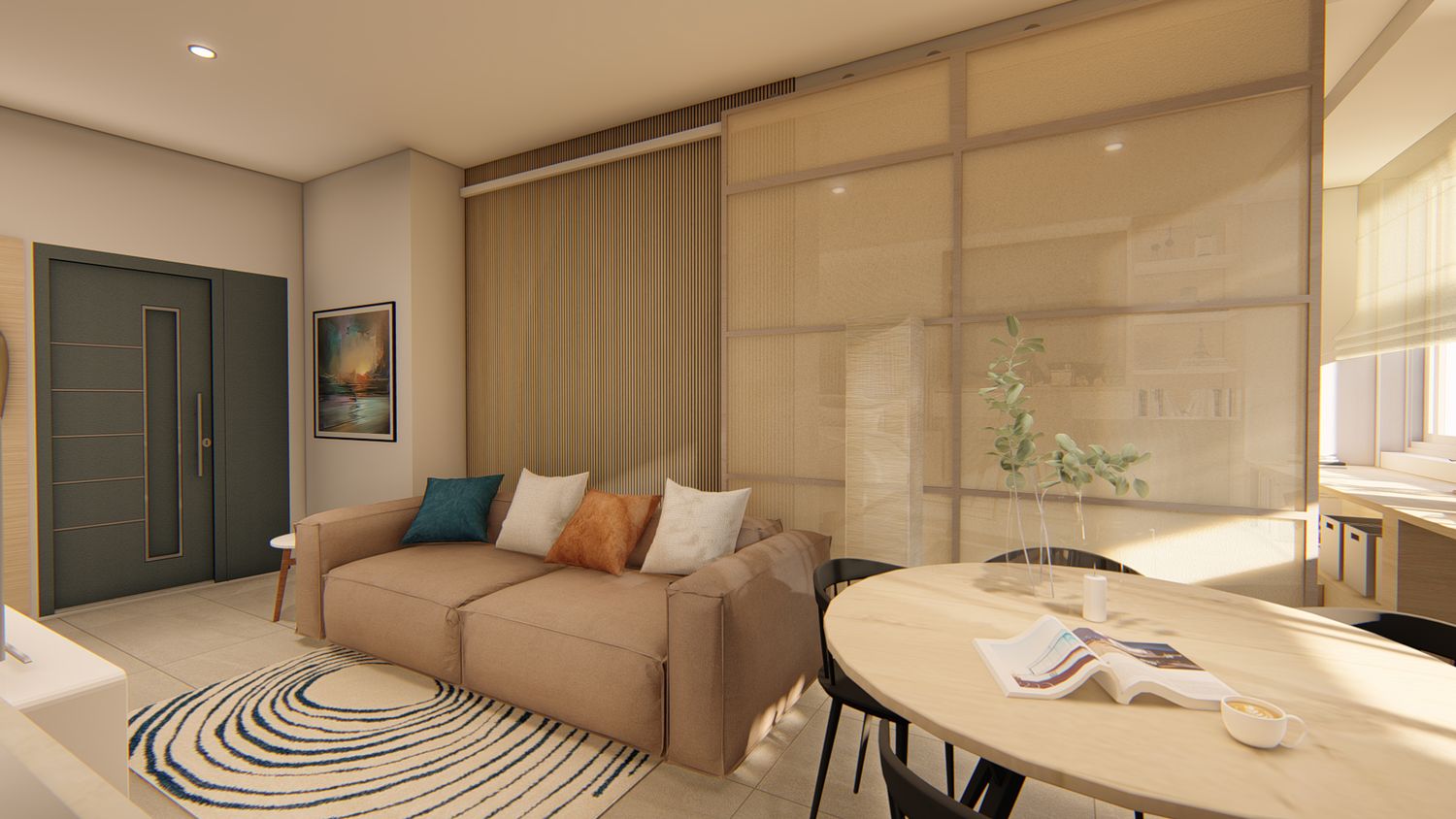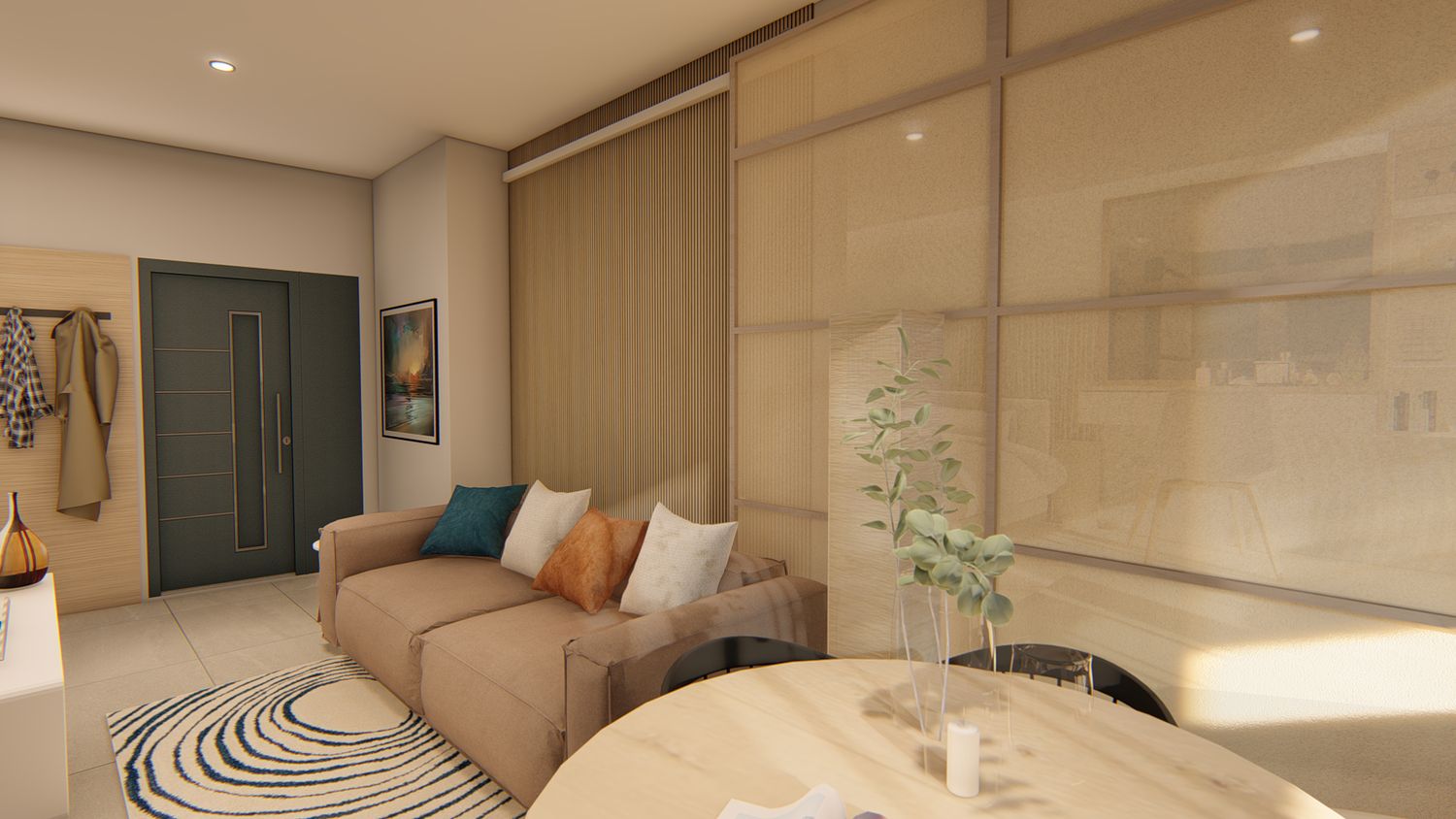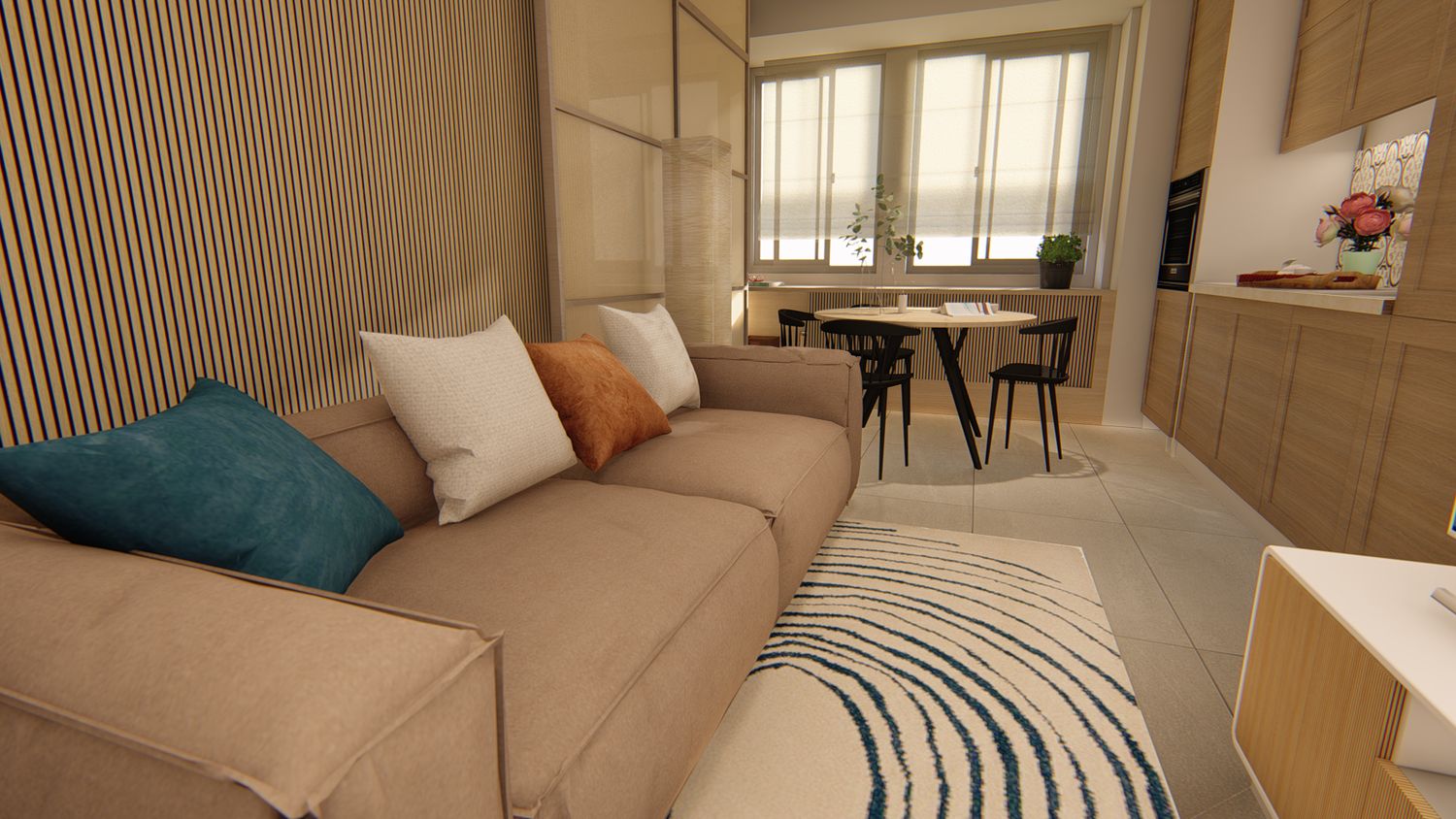 zona giorno e zona notte sono solo parzialmente separate da una parete, che verso le finestre lascia spazio ad un pannello scorrevole un'unica anta rivestita in carta di riso, in stile japandi;