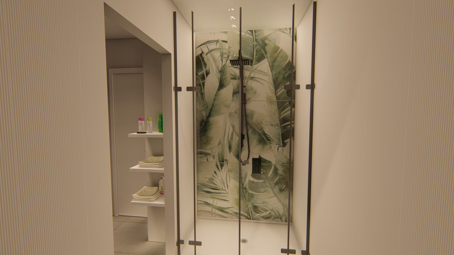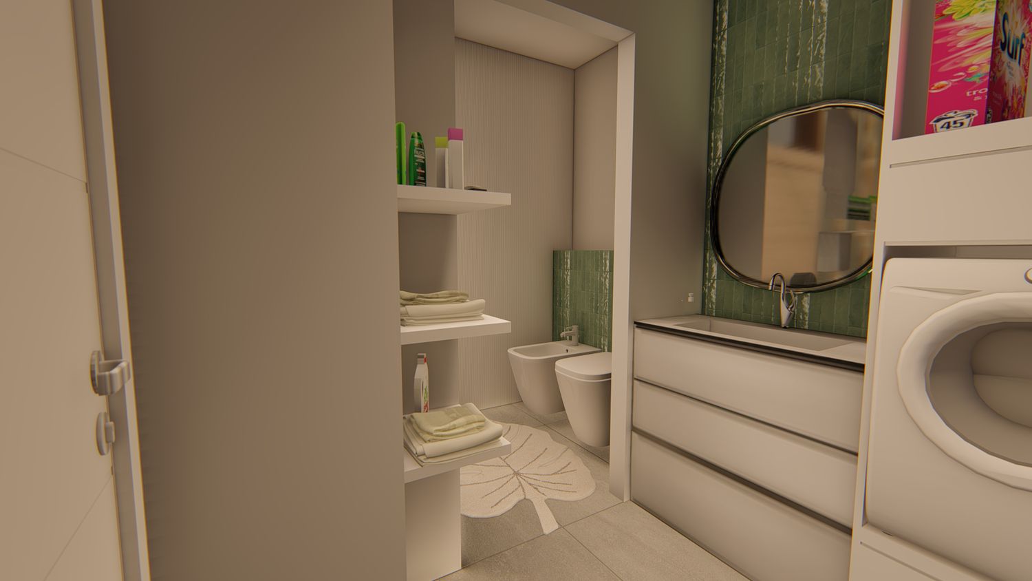 Il bagno occupa l'area a destra dell'ingresso, e comprende un antibagno attrezzato con mobile lavanderia/ripostiglio, lavabo, sanitati e una spaziosa doccia;