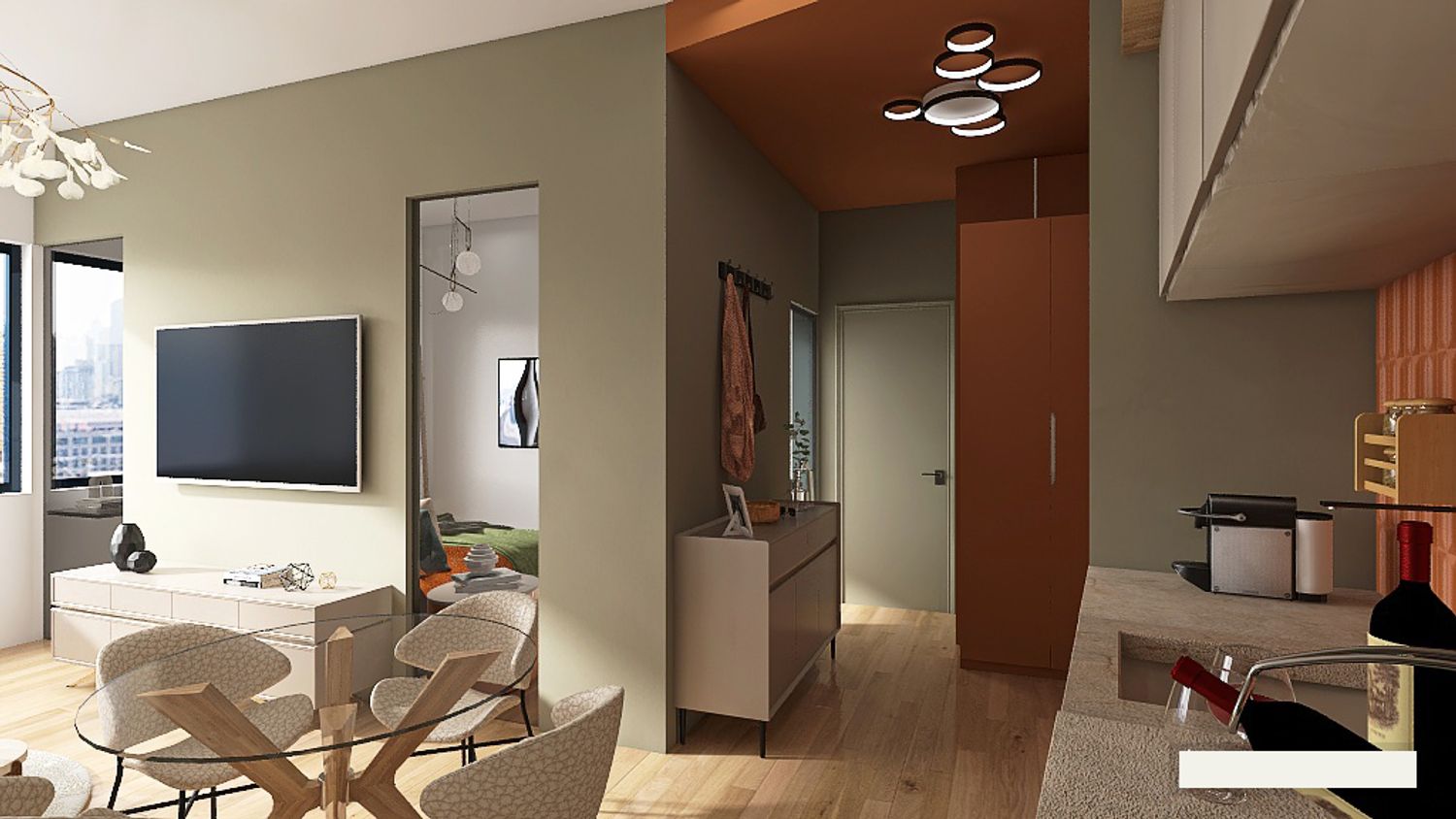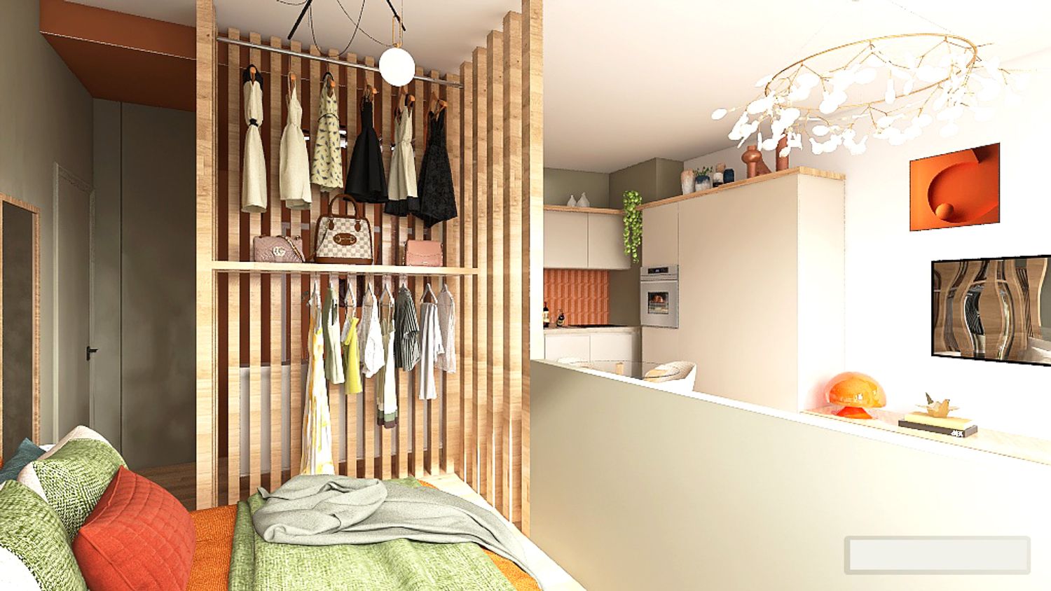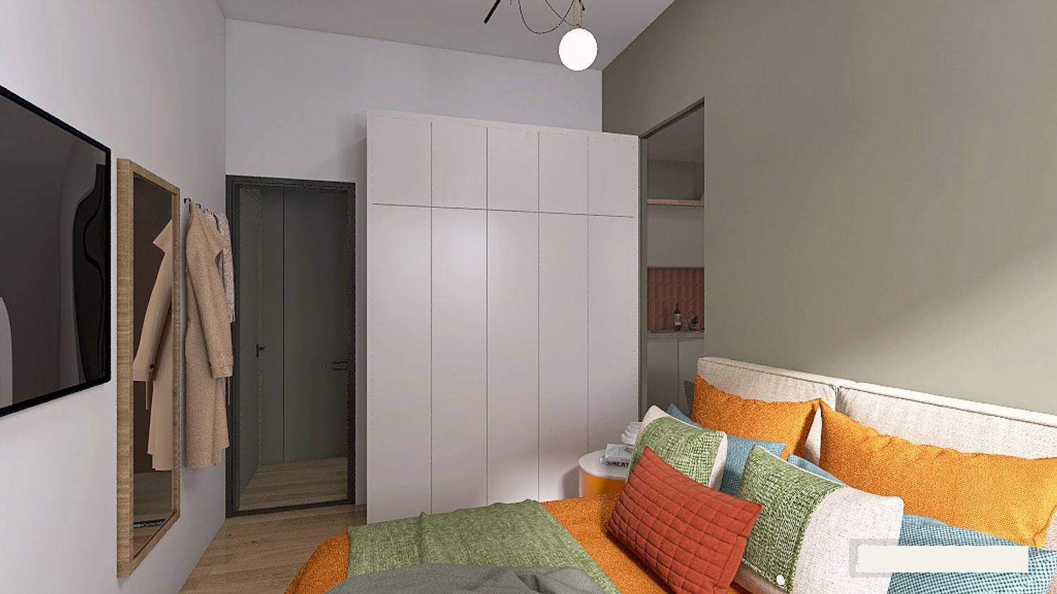 Per la camera è stata scelta quella posizione sia per avere un'aeroilluminazione naturale, sia per collegarsi con il bagno (senza interferire con la zona giorno). Il bagno si sviluppa in un antibagno con un grande lavandino ed un'armadiatura con la lavatrice (e volendo asciugatrice impilata) ed il bagno con i sanitari ed una grande doccia con nicchia. L'ingresso diventa un vero e proprio atrio e presenta un guardaroba ed un mobile sfruttando il ripiano come svuotatasche. La cucina seminascosta ad L, con i blocchi forno e frigo che, nella seconda soluzione, continuano diventando mobile tv. Nei render si comprende bene la concezione degli spazi nelle due soluzioni, con l'aiuto anche dell'uso dei materiali e colori.