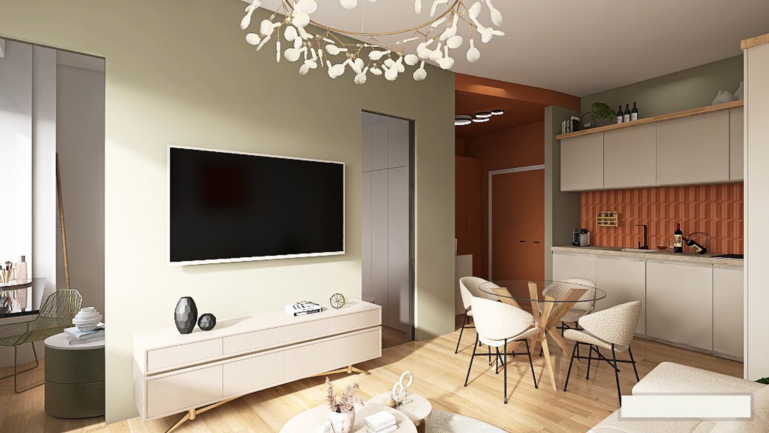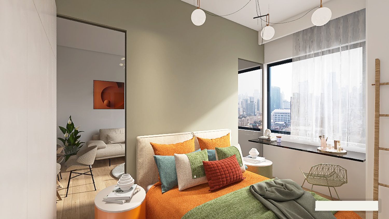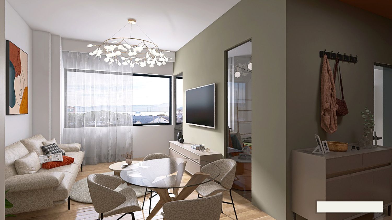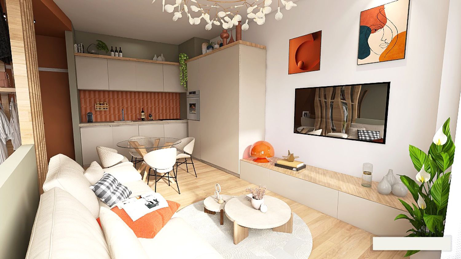 Per la camera è stata scelta quella posizione sia per avere un'aeroilluminazione naturale, sia per collegarsi con il bagno (senza interferire con la zona giorno). Il bagno si sviluppa in un antibagno con un grande lavandino ed un'armadiatura con la lavatrice (e volendo asciugatrice impilata) ed il bagno con i sanitari ed una grande doccia con nicchia. L'ingresso diventa un vero e proprio atrio e presenta un guardaroba ed un mobile sfruttando il ripiano come svuotatasche. La cucina seminascosta ad L, con i blocchi forno e frigo che, nella seconda soluzione, continuano diventando mobile tv. Nei render si comprende bene la concezione degli spazi nelle due soluzioni, con l'aiuto anche dell'uso dei materiali e colori.