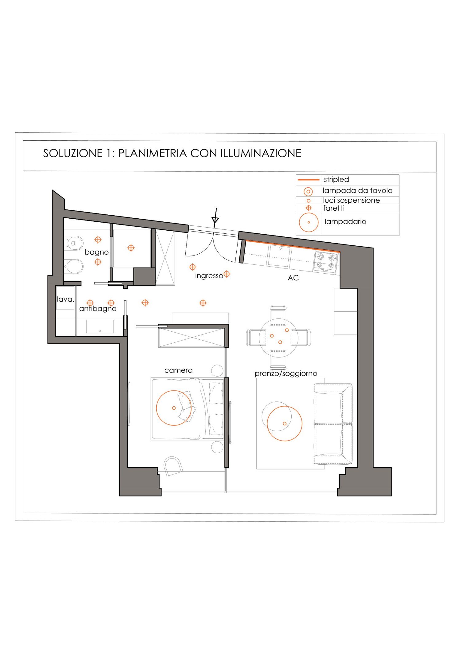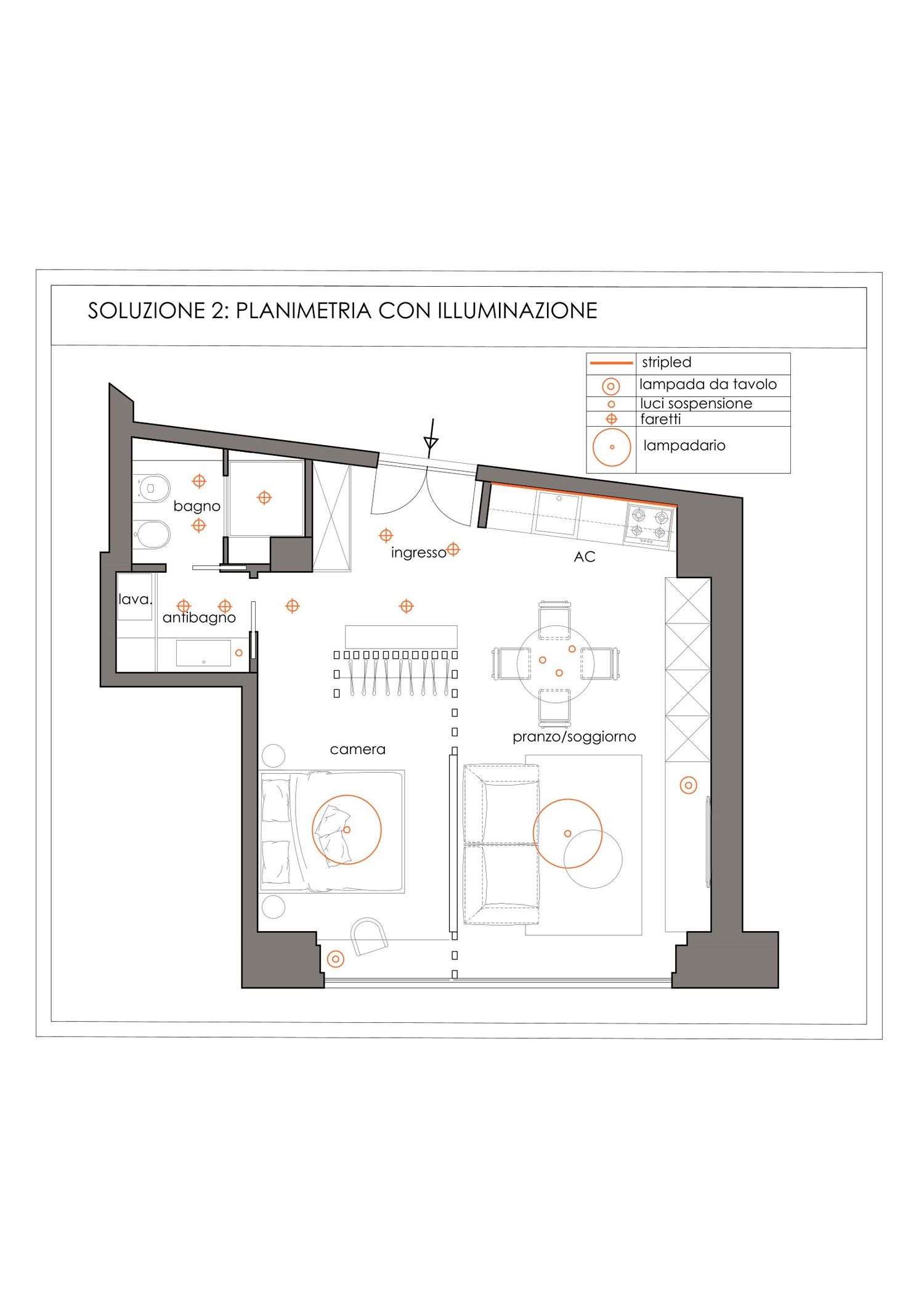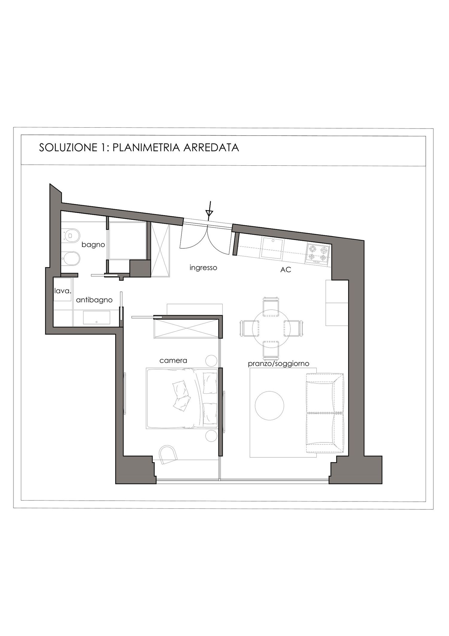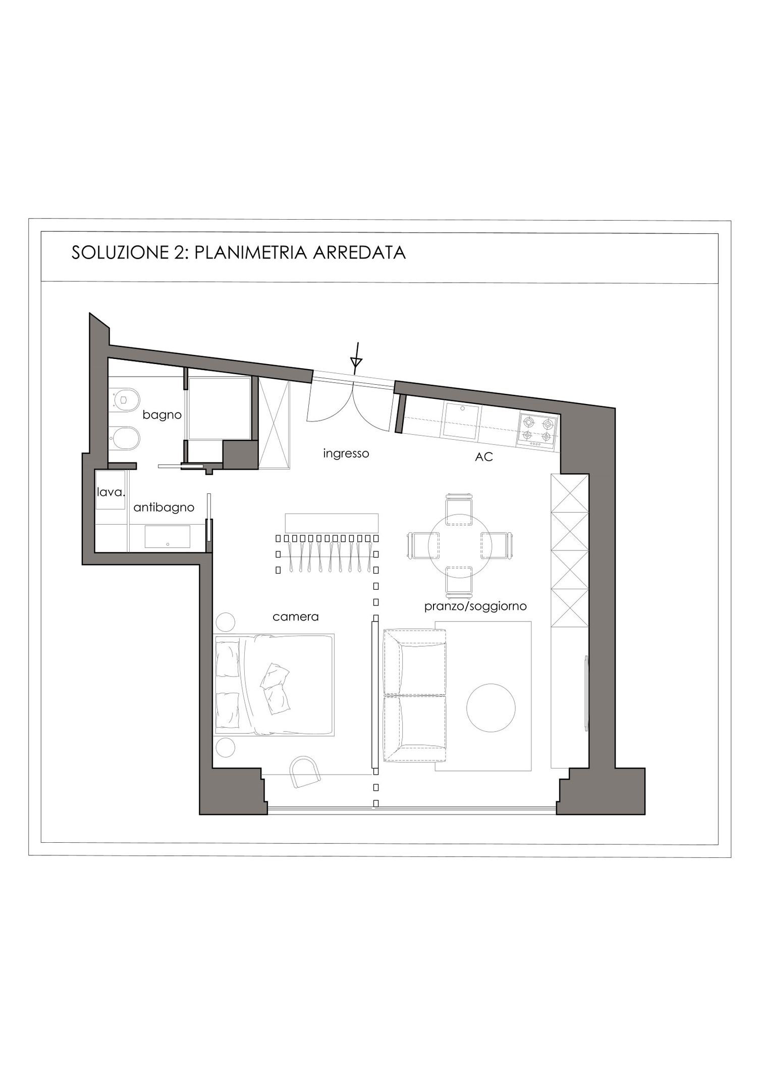 Dato che l'immobile si presta ad avere due ambienti divisi, acquistando quindi valore, si propone una prima soluzione in cui la camera è un ambiente separato, filtrato con la zona giorno attraverso aperture vetrate. Nella seconda soluzione la camera viene "filtrata" attraverso l'uso di listelli di legno, rendendo l'ambiente più unito.