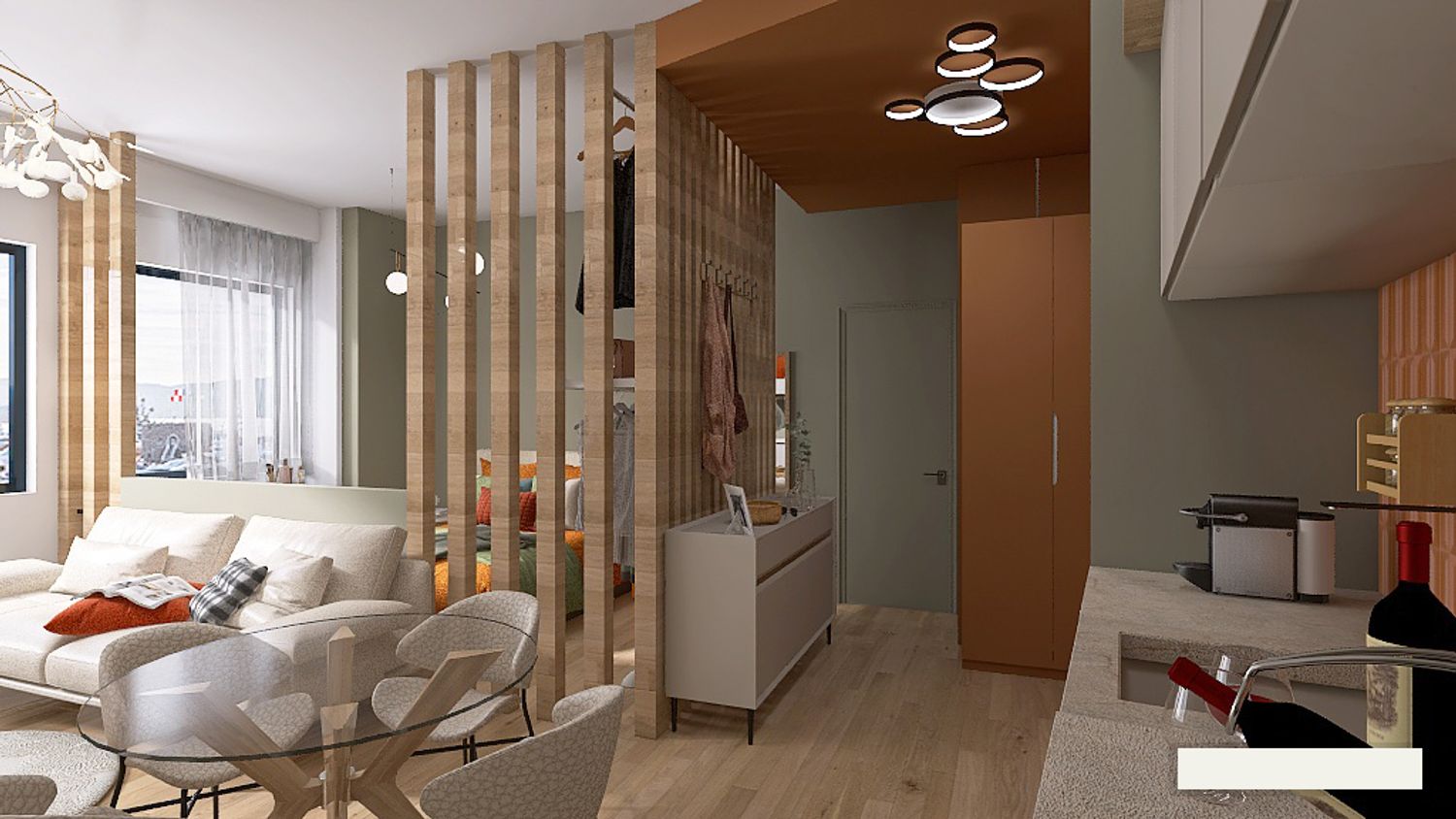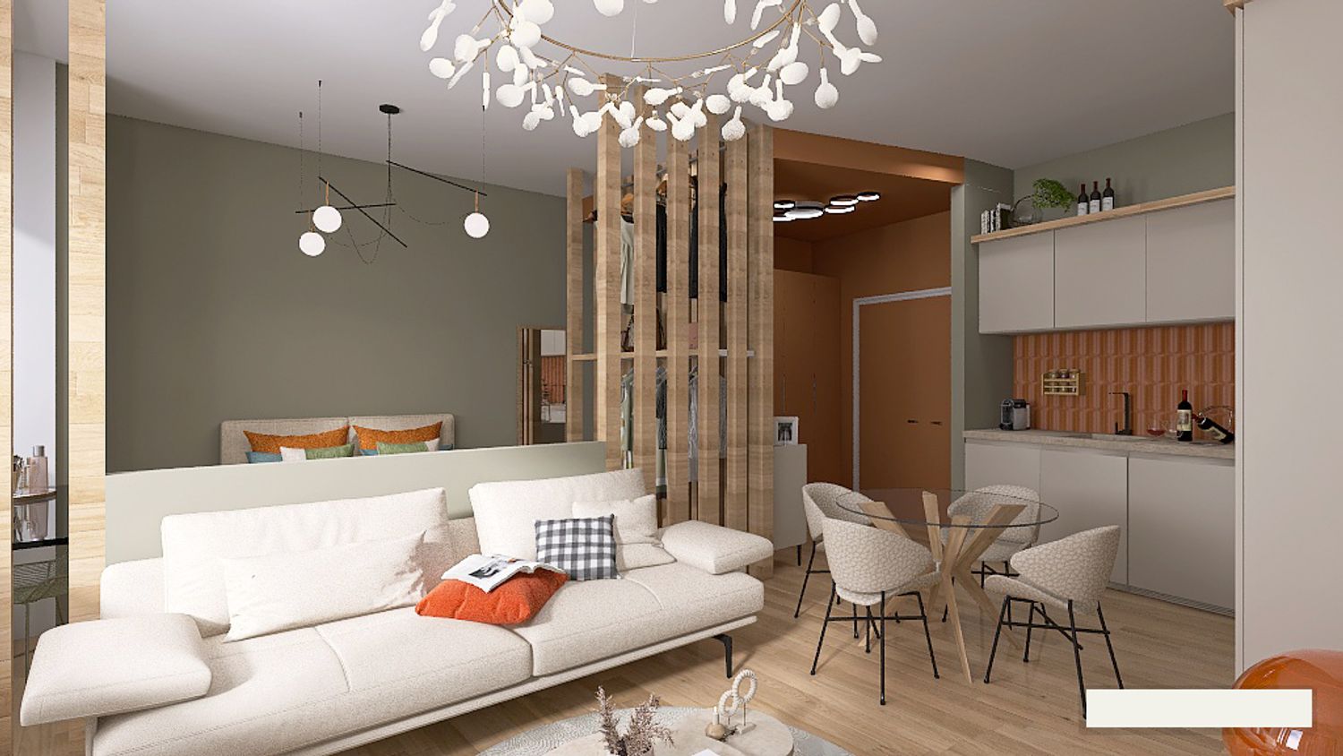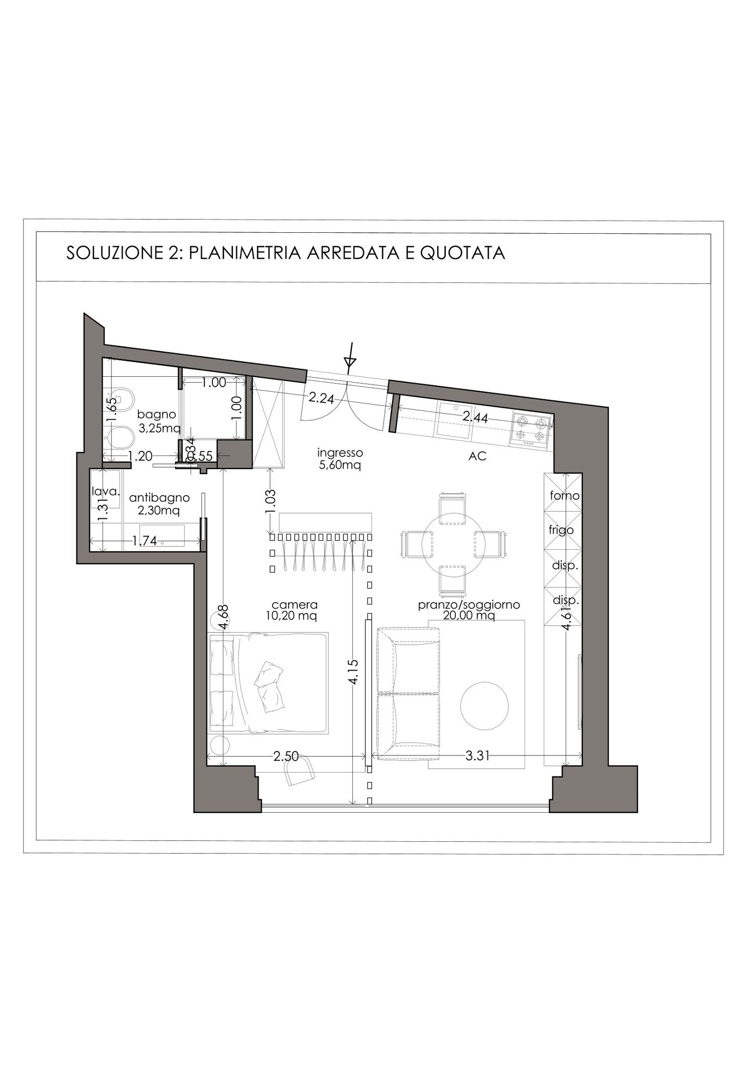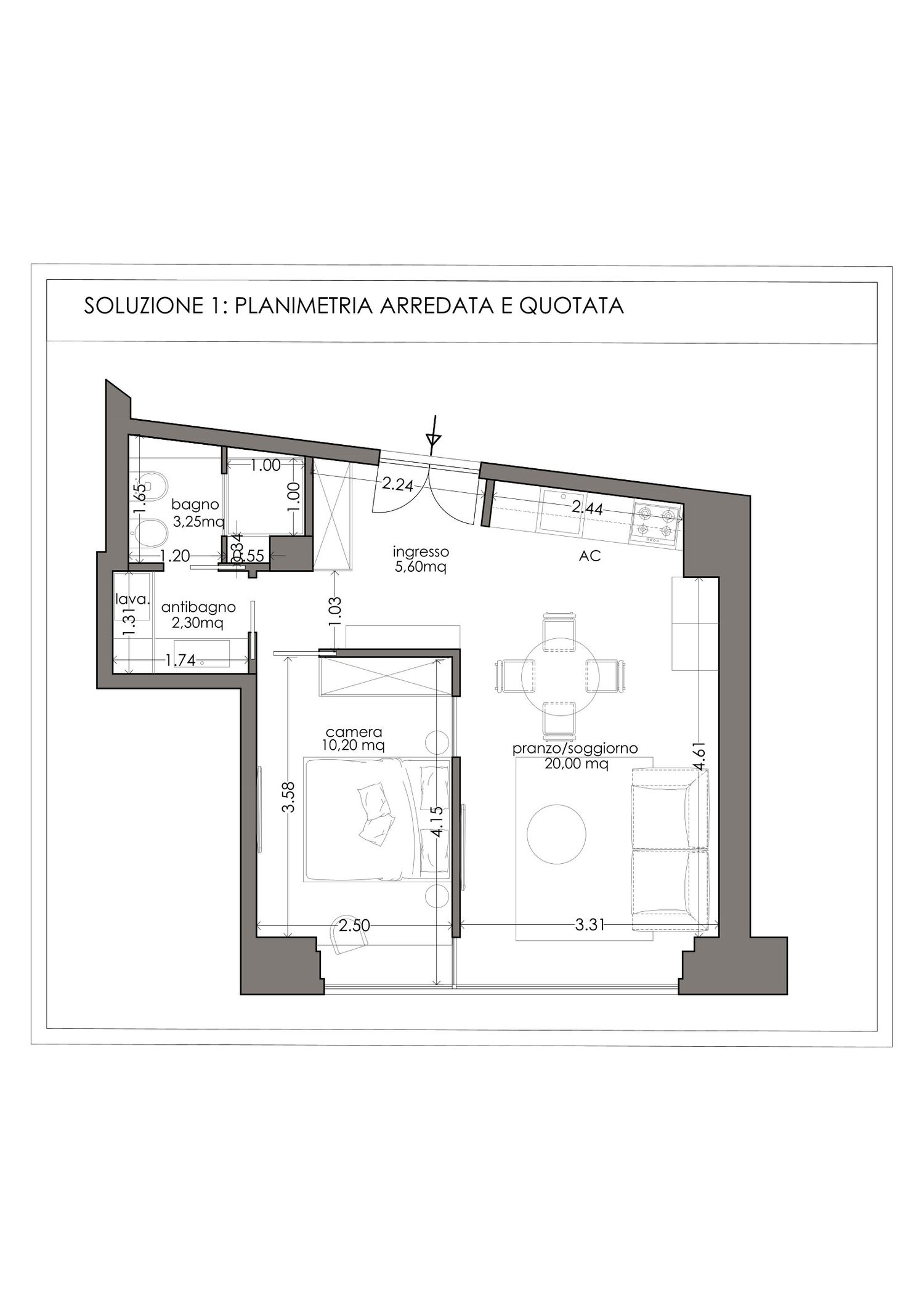 Dato che l'immobile si presta ad avere due ambienti divisi, acquistando quindi valore, si propone una prima soluzione in cui la camera è un ambiente separato, filtrato con la zona giorno attraverso aperture vetrate. Nella seconda soluzione la camera viene "filtrata" attraverso l'uso di listelli di legno, rendendo l'ambiente più unito.