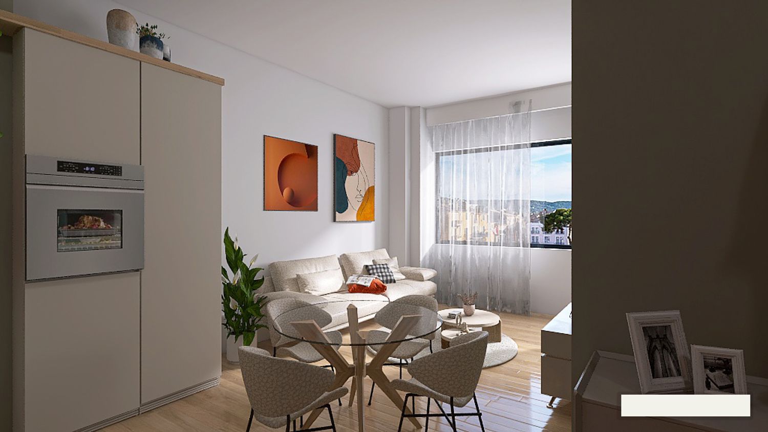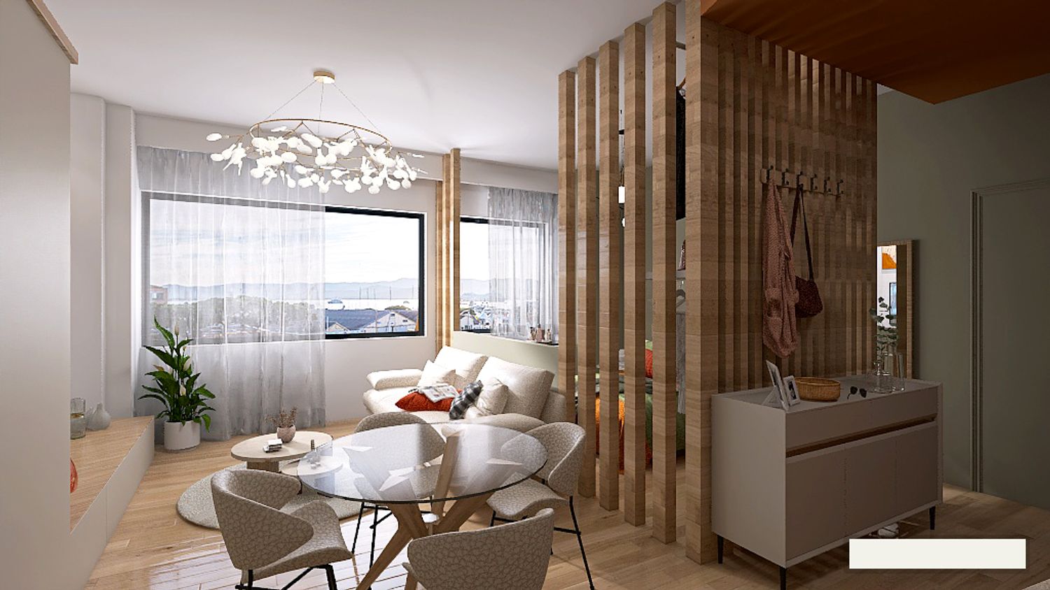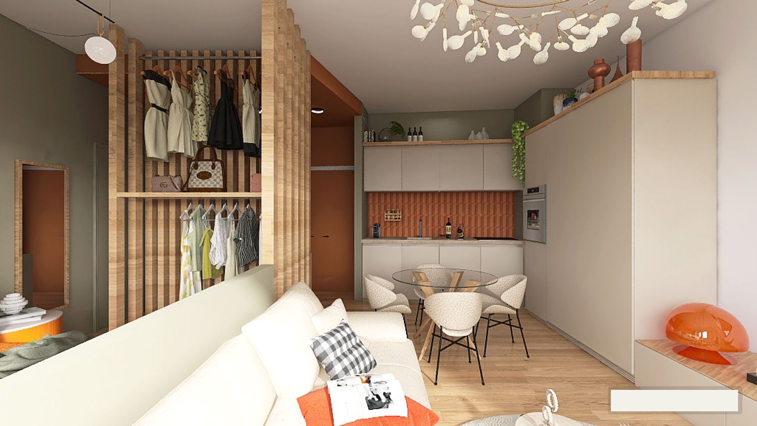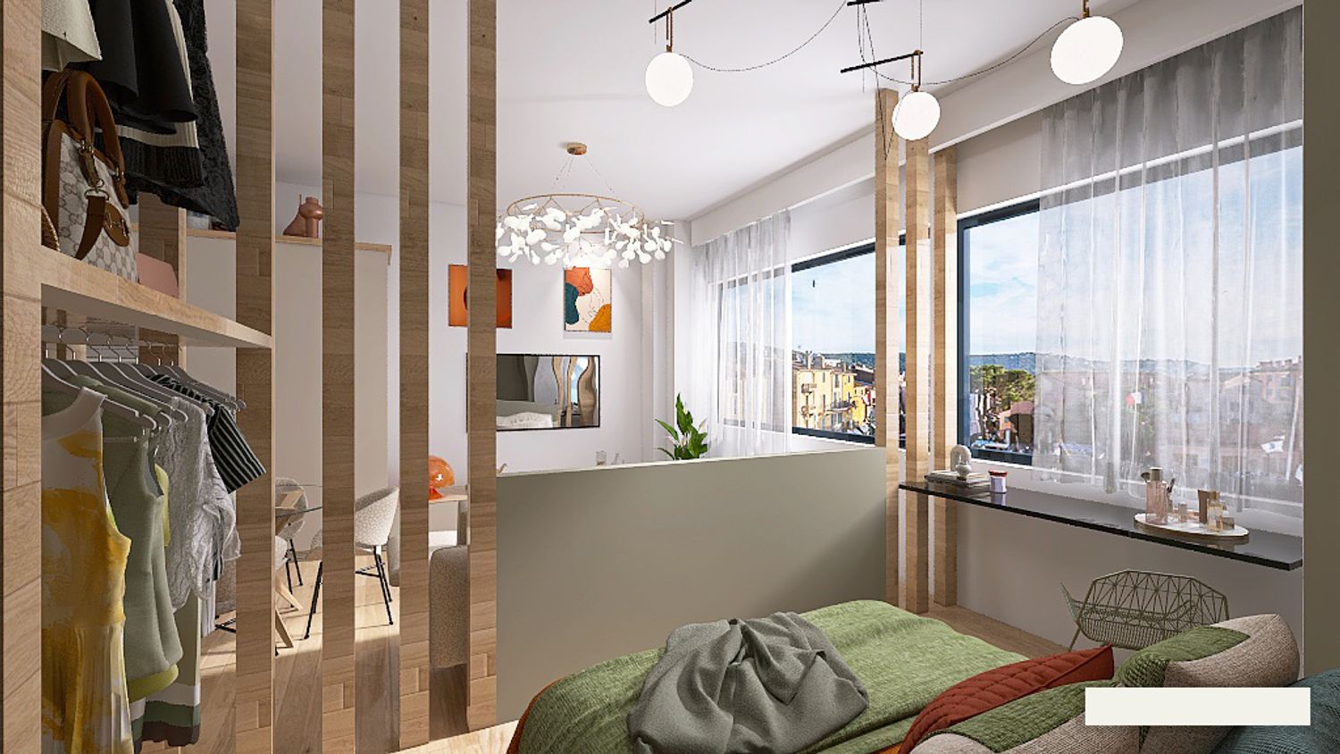 Dato che l'immobile si presta ad avere due ambienti divisi, acquistando quindi valore, si propone una prima soluzione in cui la camera è un ambiente separato, filtrato con la zona giorno attraverso aperture vetrate. Nella seconda soluzione la camera viene "filtrata" attraverso l'uso di listelli di legno, rendendo l'ambiente più unito.