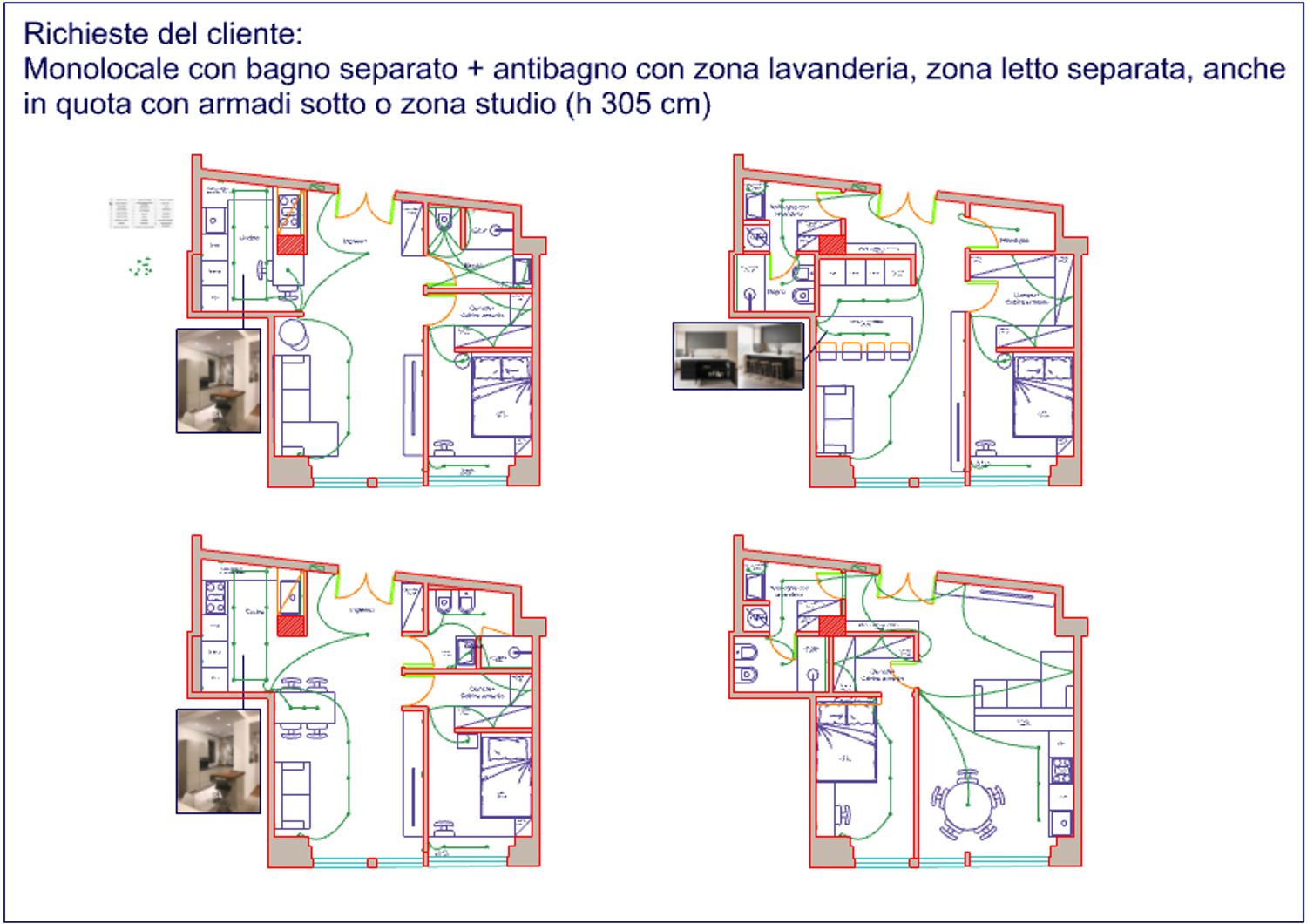 Queste quattro varianti consentono di scegliere tra un’impostazione più conviviale (con tavolo o isola centrale), una soluzione più contenitiva (con cabina armadio e mobili su misura) oppure una distribuzione più flessibile, capace di adattarsi a diverse esigenze di vita quotidiana. In questo modo l’appartamento, pur nelle dimensioni contenute, diventa uno spazio funzionale, confortevole e personalizzabile secondo le sue priorità.