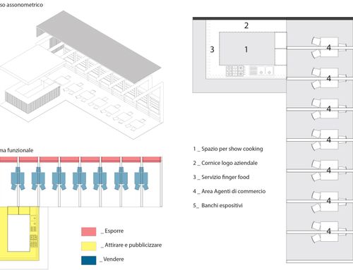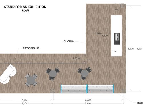 Nello stand sarà necessario predisporre lo spazio per 7 agenti di commercio, una cucina adatta ad iniziative di show-cooking corredata da banchi espositivi refrigerati.