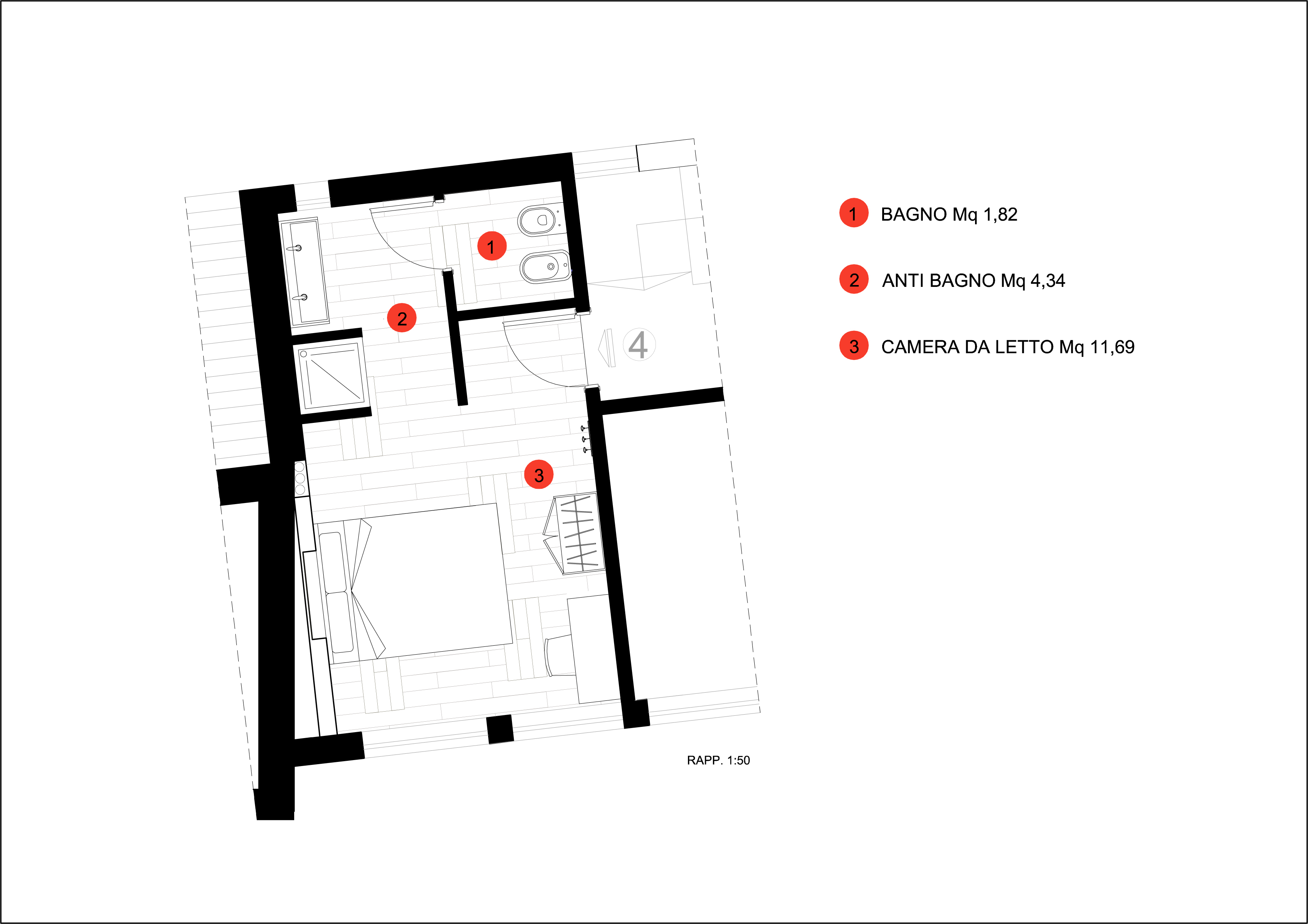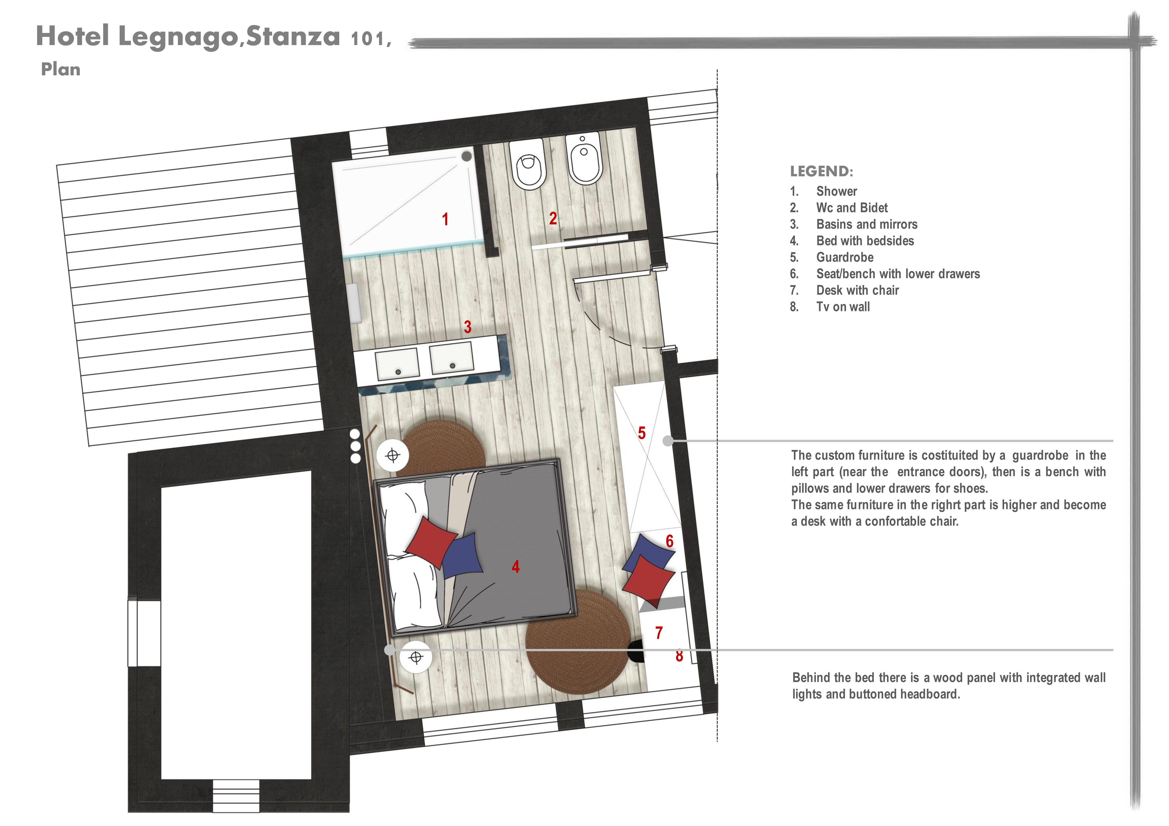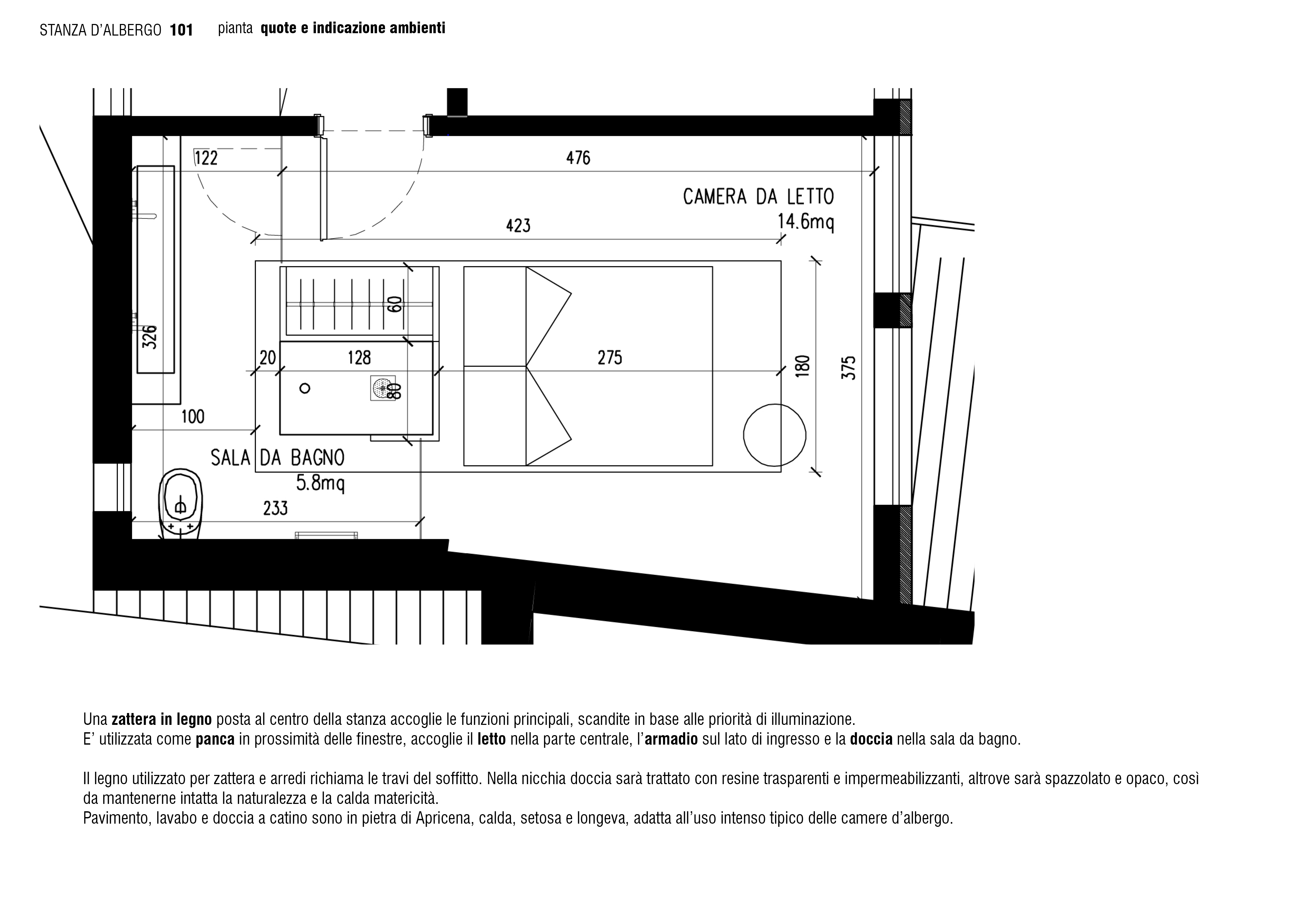 Si chiede la progettazione della stanza 101 per uso di albergo La stanza dovrebbe contenere il bagno aperto, ma si possono proporre soluzioni alternative a quella da noi prevista. La stanza 101 presenta una parete con finestre alte e la parete opposta con una piccola finestra non apribile. E' possibile creare un foro per aerazione sulla parete dove insiste la piccola finestra, ma non è possibile aprire ulteriori finestre. La parete in cartongesso da costruire sul lato testiera, potrebbe contenere degli incassi per esempio per ricavare i comodini del letto.