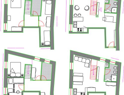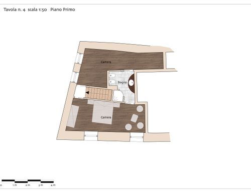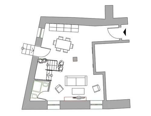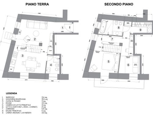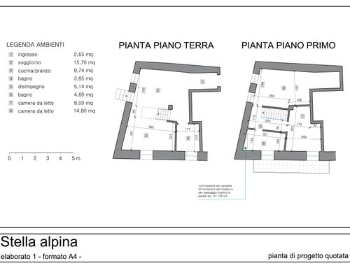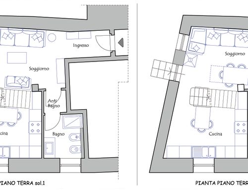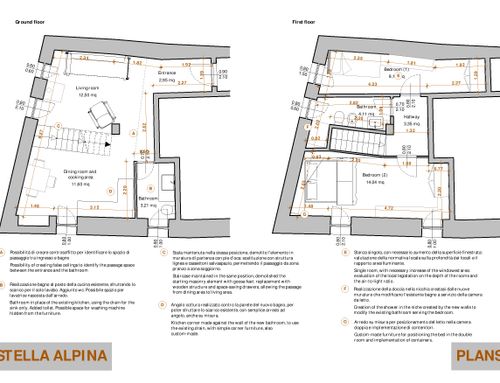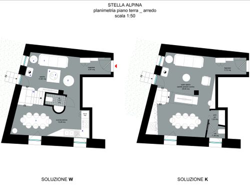 Ciao! sto comprando un appartamento a Pre Saint Didier (un paese di vacanza in Val d'Aosta vicino a Courmayeur, famoso per le terme). La casa e' originaria del 1800 ed e' stata ristrutturata 30 anni fa. L'appartamento e' su due piani: al piano terra oggi c'e' una zona giorno, una cucina separata da una parete in legno, mentre vorrei includere anche un bagno (non sono ancora sicura che il bagno possa essere realizzato dove oggi c'e' la cucina, mentre so che originariamente era dove c'e' il tavolo in corrispondenza dei bagni al secondo piano). Al secondo piano vorrei realizzare due camere ed un solo bagno. La scala e' nel mezzo dell'appartamento e mi piacerebbe valorizzarla trasformandola in un elemento di arredo e non solo una scala (senza pero' spostarla). Il riscaldamento sara' inoltre con stufa a pellet, altro elemento architettonico da valorizzare. Il pavimento al piano terra e' in pietra e vorrei mantenere questo stile aggiungendo anche legno e ferro. Sto pensando ad una soluzione in stile montagna, ma molto semplice e naturale che rispetti l'ambiente circostante, calda ed accogliente. Altre info: l'appartamento ha accesso principale al piano terra dall'edificio, ma anche da un giardinetto di circa 9mq proprio di fronte. L'altezza in tutte le stanze e' di 2,20m