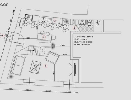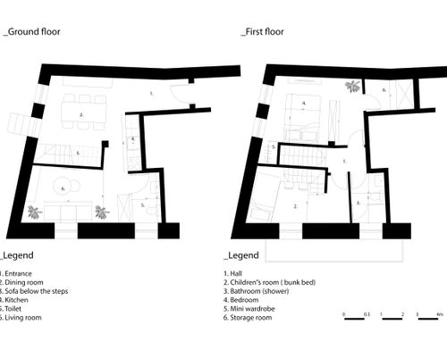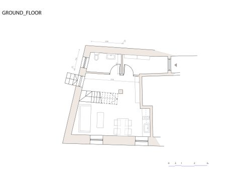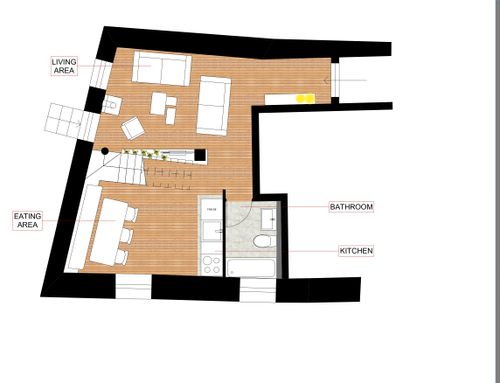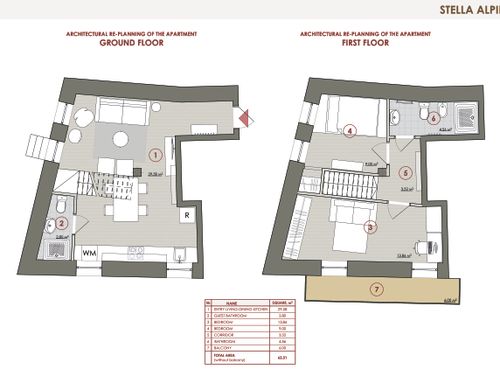 Hi, I am buying an apartment in Pre Saint Didier (nice location in Val D'Aosta close to Courmayeur, Italian Alps). The building is from 1800 and has been restructured 30 years ago (picture attached). The apartment is divided in 2 floors. Currently ground zero is only living room and kitchen whilst I am looking to a solution where I could have also a small bathroom (not sure if the bathroom should be realized where the kitchen is, hope so but still not sure if feasible, originally it was where currently there is the table in correspondence of the bathroom at second floor). Second floor I would like to realize 2 rooms and only 1 bathroom. In addition, the stair is just in the middle of the apartment and I would like to make it a design element more than just a stair, without moving it. The apartment will included a pellet eater as in Northern Europe that today is close to the table. The floor is in stone in ground zero and I would like to keep it adding elements in wood and iron. I am looking for a simple solution in alpine and natural style that could match with the natural environment around, but charming and cosy.