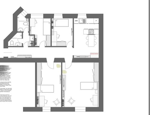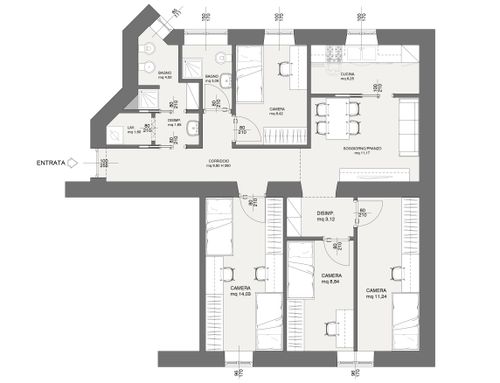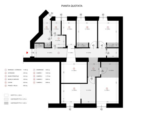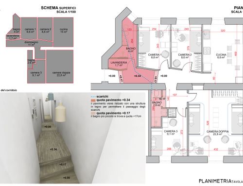 Si possono distribuire in modo diverso le stanze, inclusa la cucina; in questo caso, porre attenzione alla caldaia che non può essere posta in una stanza dove si dorme; la caldaia sarà sostituita: sarà un modello murale con misure indicative 1000x600x500 mm (hxlxp) - non può essere posizionata in un altro posto a causa di limiti tecnici (posizione del camino, ecc).