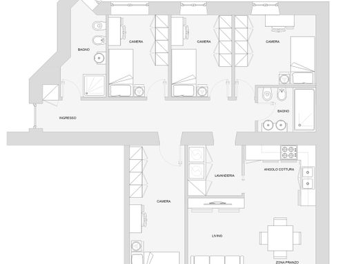 Con almeno 4 stanze singole, 2 bagni, cucina con spazio per il pranzo (tavolo).