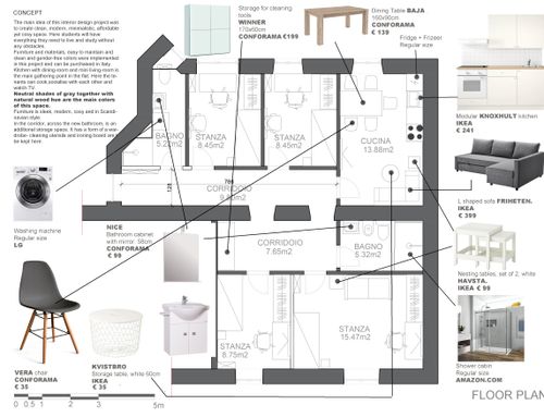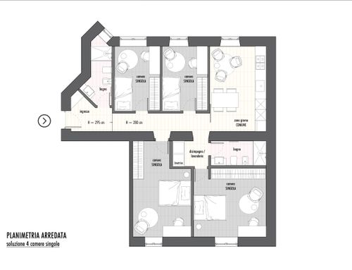 Le stanze devono avere almeno un letto, scrivania, libreria, armadio, tv. Eventualmente una poltrona se c'è spazio. Altre caratteristiche a vostra scelta.