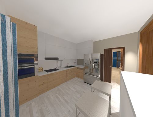 -	Nell’area a forma di L indicare la posizione migliore x la Cucina ( che deve essere con penisola e deve prevedere un ampio piano lavoro) secondo  lo stile immagini inviate