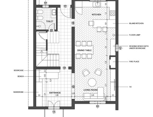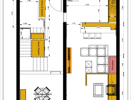 - In the fireplace area, which cannot be moved, create a situation in which we can sit / read. There isn’t any bond for the fireplace orientation that can be also a furnishing element
