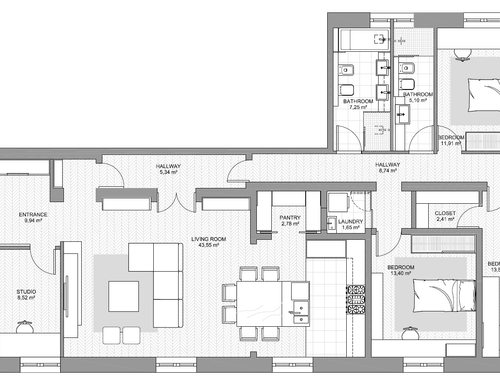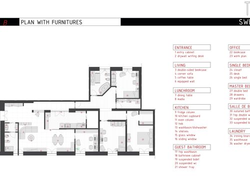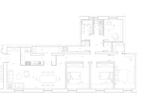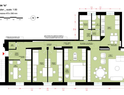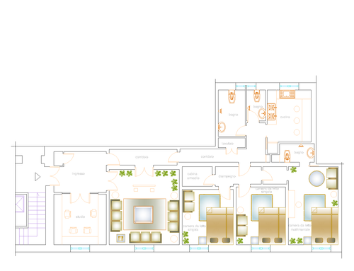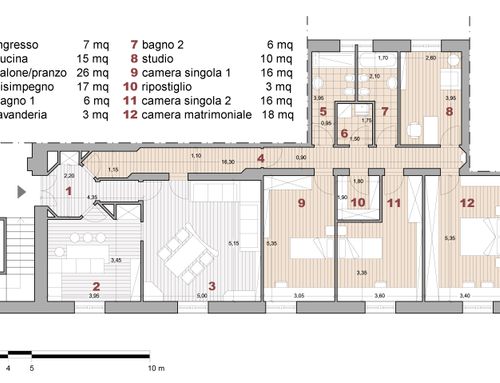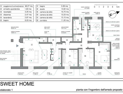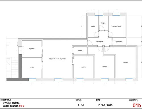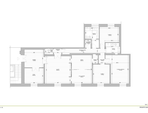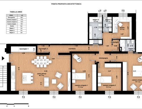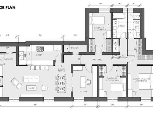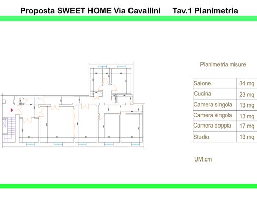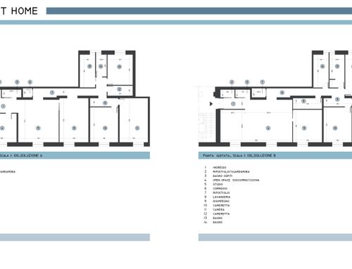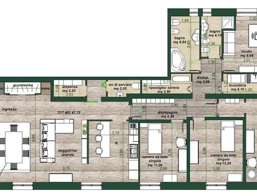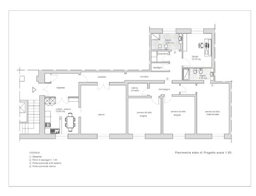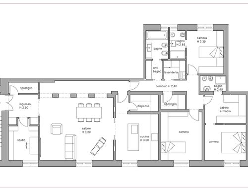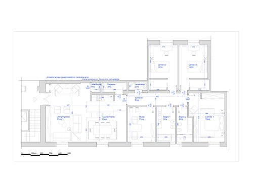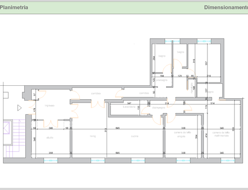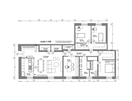 vorrei ridistribuire gli ambienti con una zona giorno più ampia e una cucina più ampia. occorre mantenere lo studio più tre camere da letto ,avrei bisogno anche di un ripostiglio e lavanderia