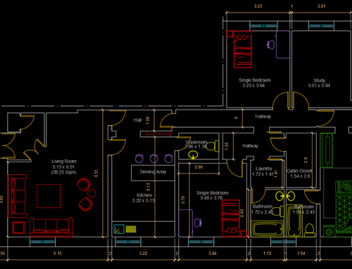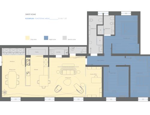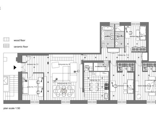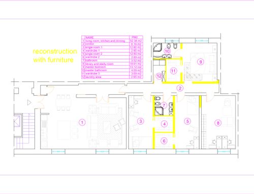 I would like to redistribute the rooms with a larger living area and a larger kitchen. it is necessary to maintain the room for the study plus three bedrooms amd also a closet and a laudry