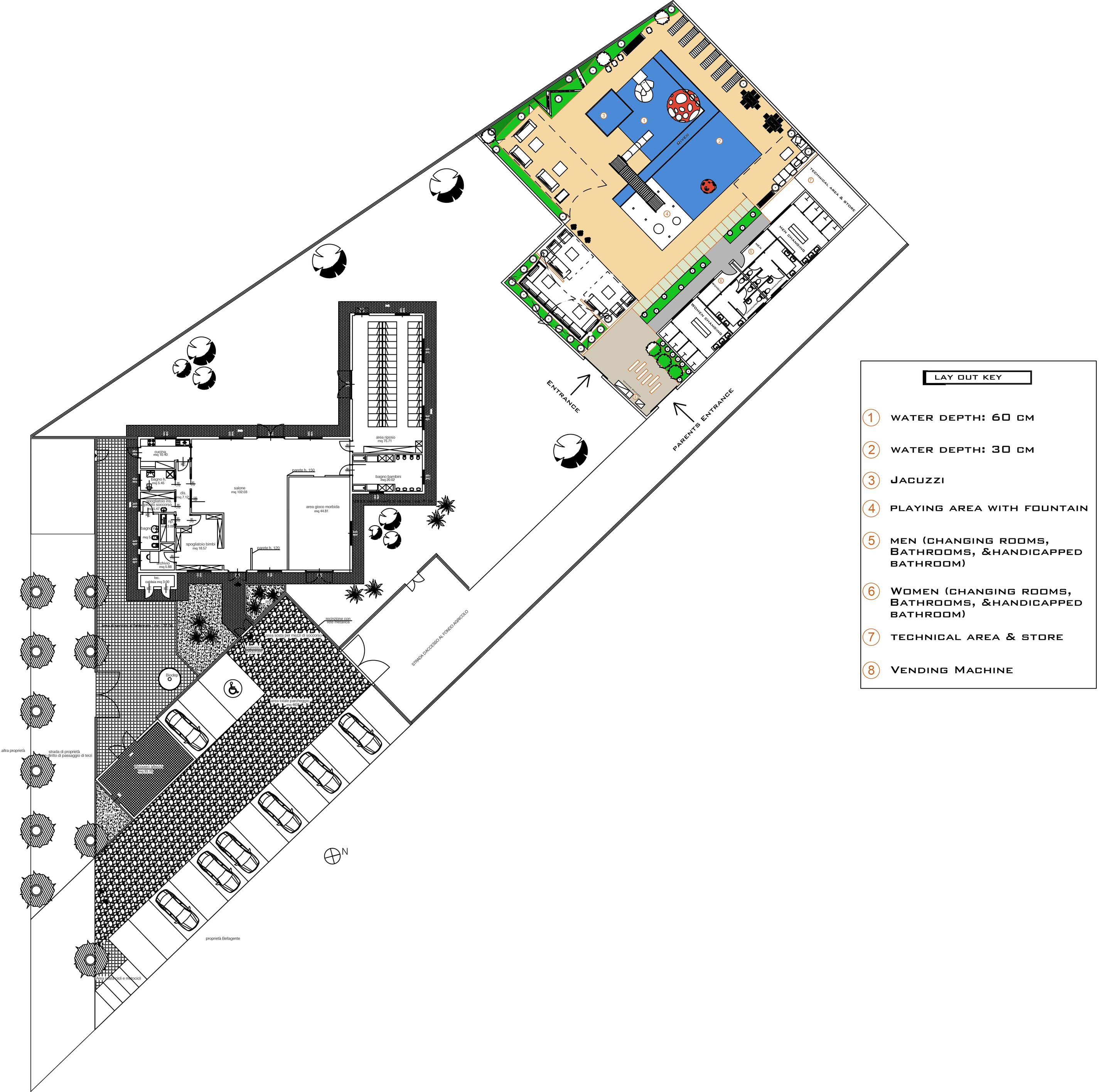 The changing rooms, bathrooms and technical areas as a matter of slopes should be in the orange zone.