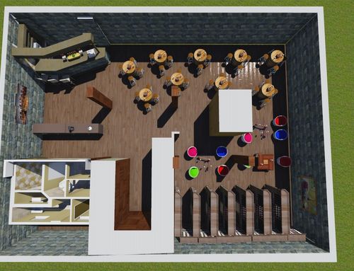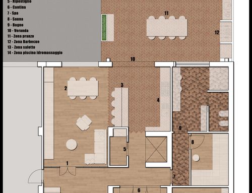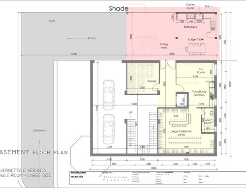 In particolare la tavernetta deve comprendere: cantina grande per inserimento bottiglie, botti ecc., angolo bar, comodo bagno (sotto la finestra piccola è previsto lo scarico), sala TV,  cucina funzionale, ecc., ecc..