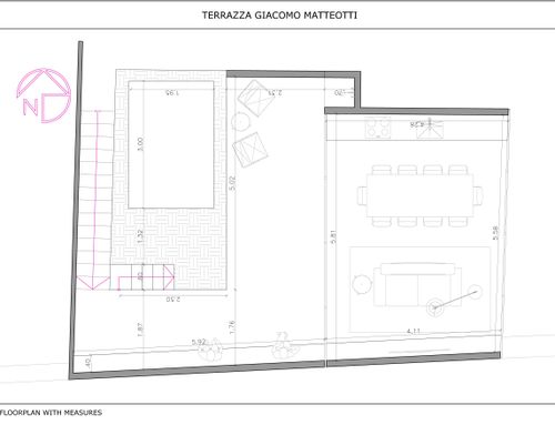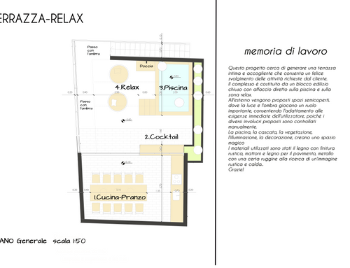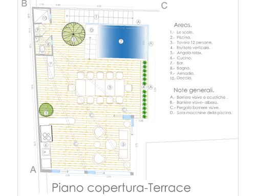 Desideriamo avere una piccola piscina, dimensioni massime 3 m x 2 m oppure 3 m x 3 m, da posizionare obbligatoriamente nell’angolo dove indicato, per questioni strutturali. Deve esserci una doccia.