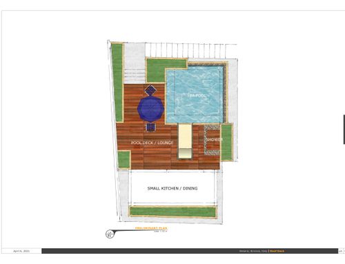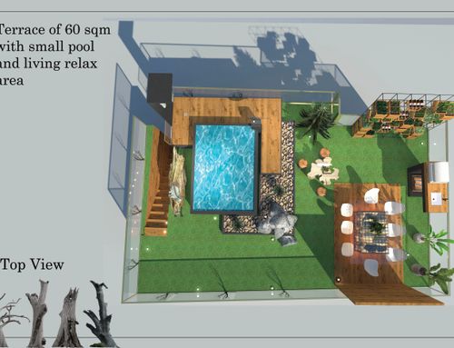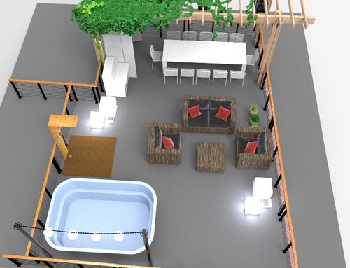 We would like a small pool, at maximum 3 m x 2 m or 3 m x 3 m, to be compulsory placed at the corner, due to structural needs. We also want a shower. In the living area we want a small kitchen, with a counter to cook. A table with 10-12 seats, maybe extendible, complete this area.