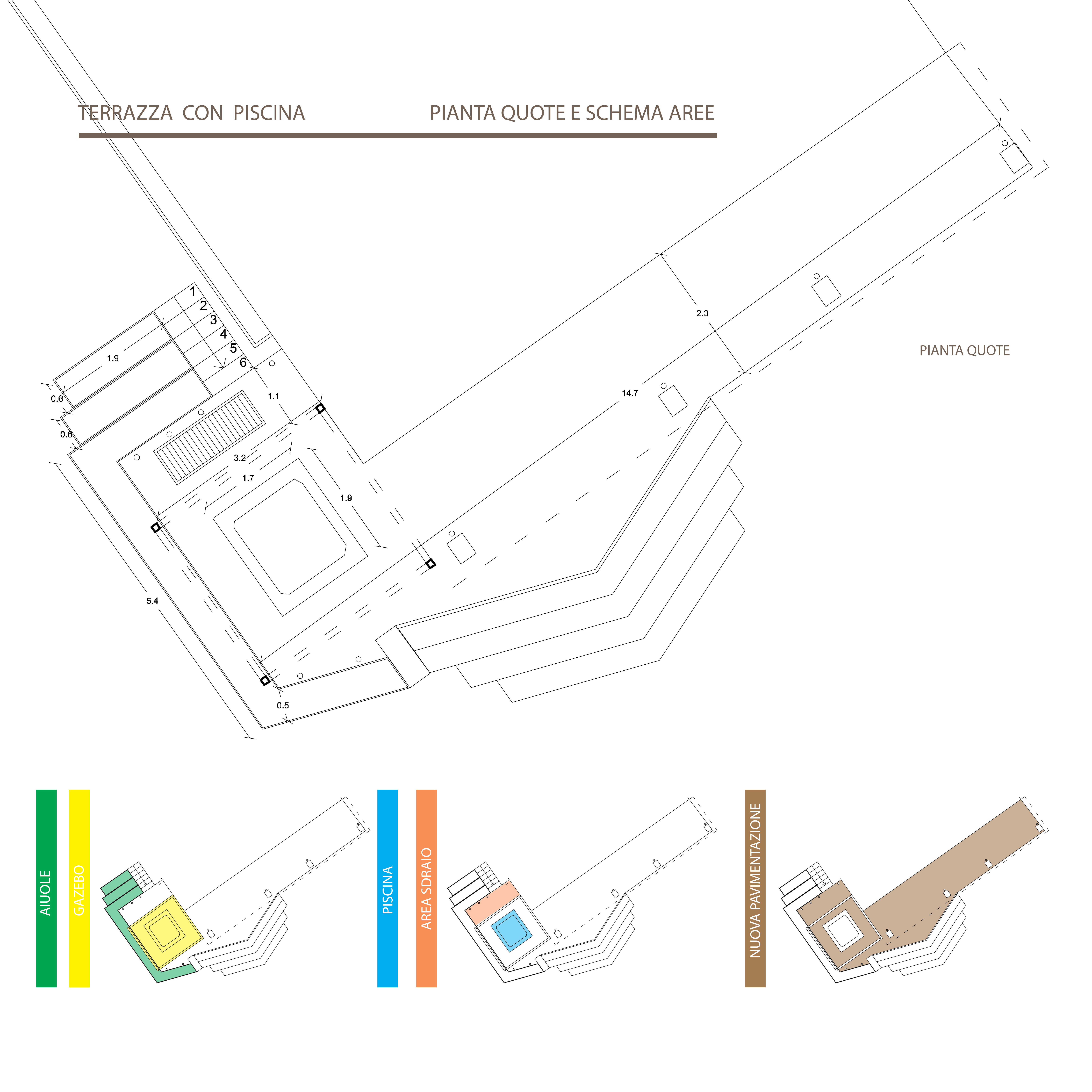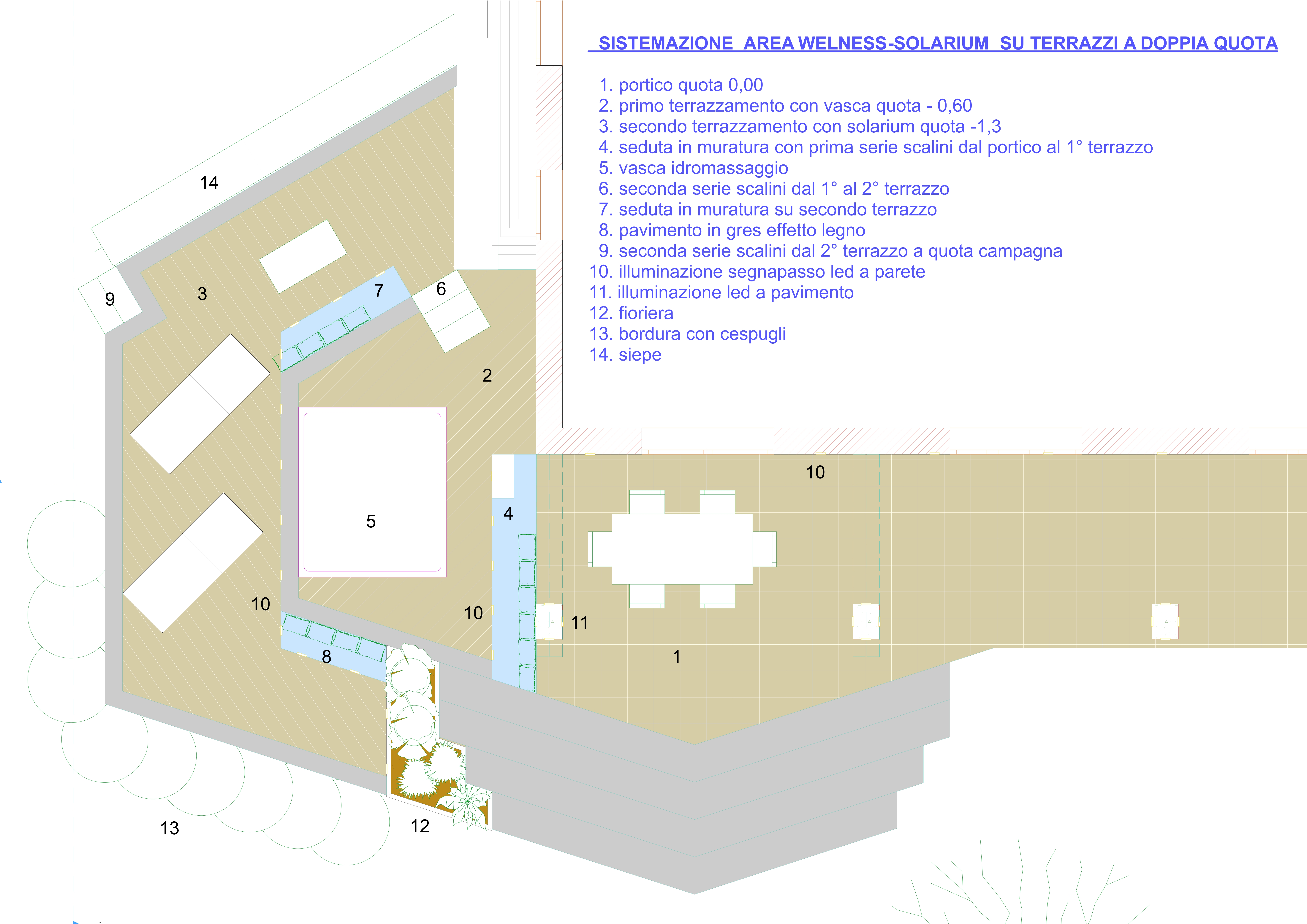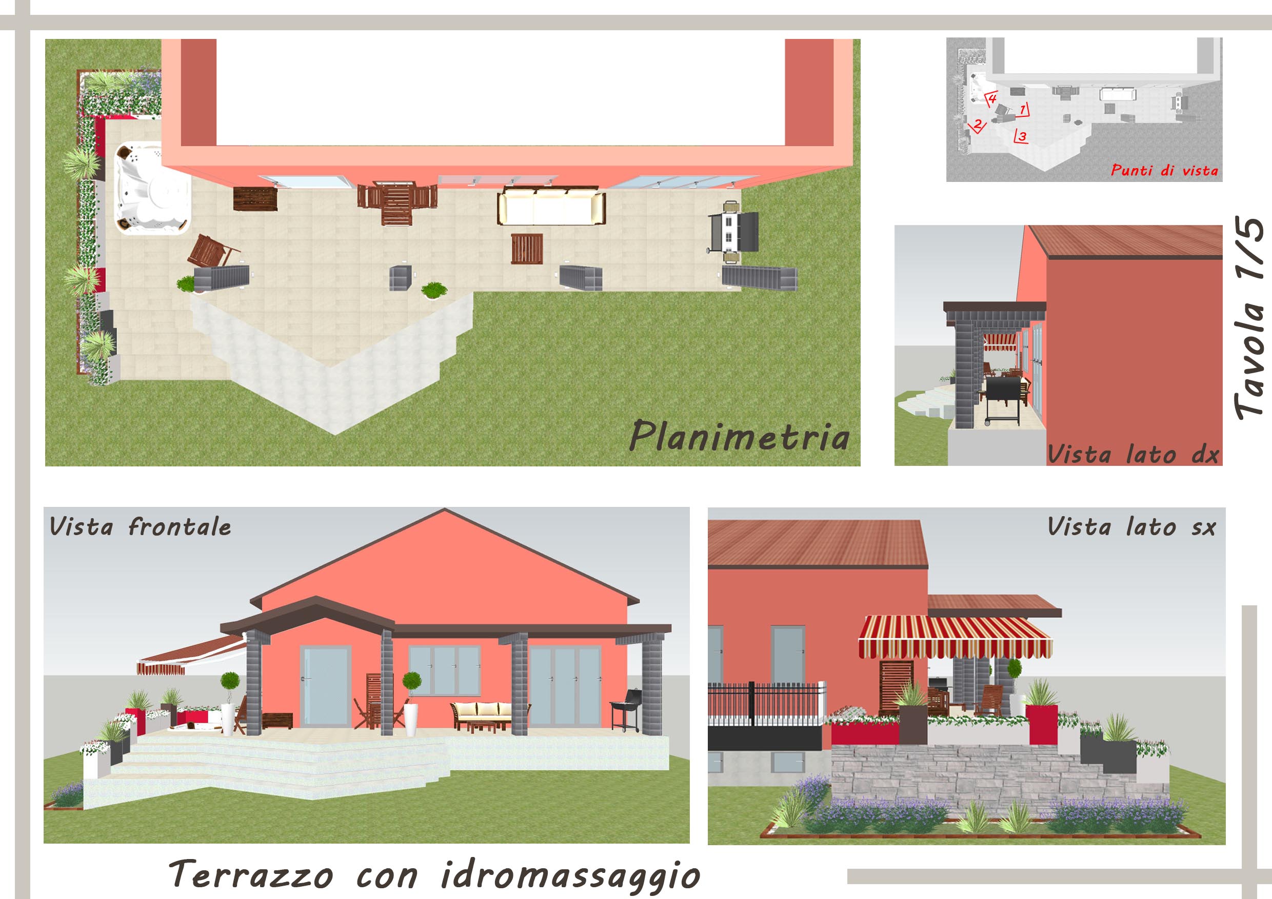 c'è un bagnetto ed e è quindi la posizione ideale per intercettare quanto necessario ( scarico acque , carico acqua calda e fredda , energia elettrica ) ho gia un progetto di massima , ma non mi convince , in particolare vorrei meglio definire piano finale contorno minipiscia e materiale ceramico per la pavimentazione di tutto il terrazzo.-