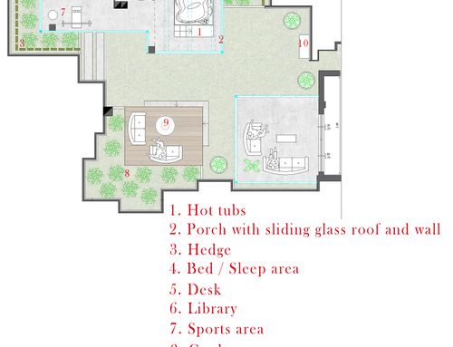 On the perimeter of the terrace plants or hedges able to create privacy. In particular, I would like to create an area with shrubs and plants with a light trunk or something similar to create a small garden corner. All the flooring on the terrace must be floating. I would like to have a part of the terrace with high quality synthetic grass flooring. The porch will be used as an office / small gym and, if necessary, as a bedroom (wall bed).