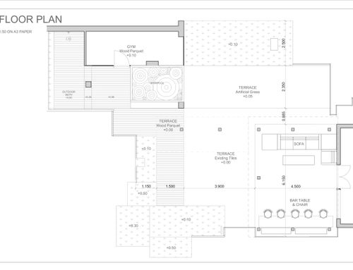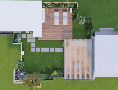 En el perímetro de la terraza plantas o setos capaces de crear intimidad. En particular, me gustaría crear un área con arbustos y plantas con un tronco ligero o algo similar para crear un pequeño rincón de jardín. Todo el suelo de la terraza debe ser flotante. Me gustaría tener una parte de la terraza con suelo de césped sintético de alta calidad. El porche se utilizará como oficina / pequeño gimnasio y, si es necesario, como dormitorio (cama abatible).