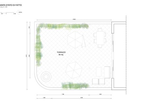 Abbiamo necessità di sostituire la pavimentazione del nostro terrazzo. Dato che l’intervento è invasivo abbiamo deciso di stravolgere lo stile del nostro spazio esterno. Il design deve essere contemporaneo, fresco, di forte impatto visivo. Non sappiamo se preferire un rivestimento flottante o una gettata di microcemento. Sicuramente vogliamo che sia eccezionalmente duraturo e vogliamo coprire la metà della metratura con una pergola che deve esse autoportante per la normativa del nostro comune. Oggi una serie di vasi con gelsomini ci garantiscono privacy e la vista del verde cui teniamo molto. I gelsomini si sono rivelati la scelta giusta perché sufficientemente rustici da resistere in vaso su un terrazzo esposto a sud, ma perdono molte foglie che intasano i canali di scarico, perciò la scelta di come distribuire il verde sarà strategica. Abbiamo anche necessità di una quinta o un piccolo angolo dove riporre la scopa e qualche piccolo attrezzo. Il terrazzo misura 8*10 mq , nonostante non abbiamo case prossime al nostro spazio, la privacy è importante e come delimitare il perimetro sarà una scelta fondamentale. Siamo alla ricerca di soluzioni contemporanee, vogliamo che sia incluso nell'architettura un elemento che sia di intrattenimento per i bambini ed allo stesso tempo di forte impatto dal punto di vista del design come un' altalena o uno scivolo,un rifugio, una vasca , o una sabbiera. La pergola dovrà coprire la metà dell'area per permetterci di stare all'aperto anche in caso di pioggia lieve. Vorremmo mantenere l'arredo ma non è fondamentale. Particolare attenzione va data alla scelta dei materiali e all'illuminazione che dovrà creare un ambiente suggestivo di sera. Il budget è un punto fondamentale del progetto: non abbiamo ancora definito il nostro tetto di spesa ma valuteremo anche in base questo elemento.