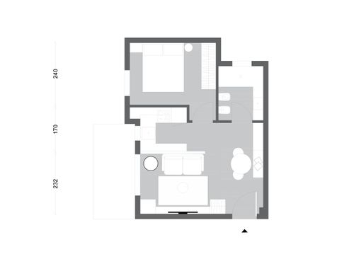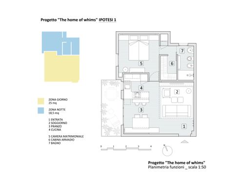 the living room area to be furnished completely, first of all I would close the living area with that night, (currently open), with a flush door, smaller than the current opening, in order to recover precious cm to furnish the wall with TV, etc. ..,