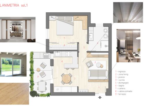 la zona salotto da arredare completamente, innanzitutto chiuderei la zona giorno con quella notte, (attualmente  aperta), con una porta a filo, di larghezza inferiore all'attuale apertura, in modo da recuperare cm preziosi per arredare la parete con tv, ecc ...,