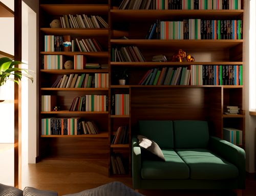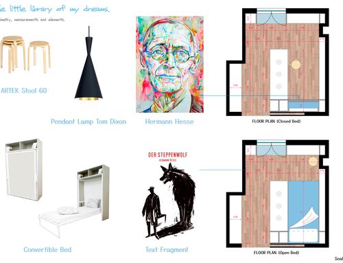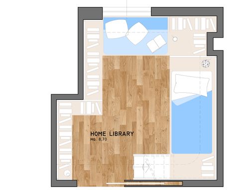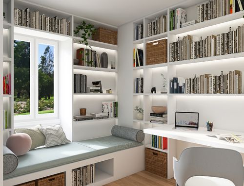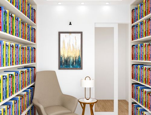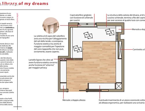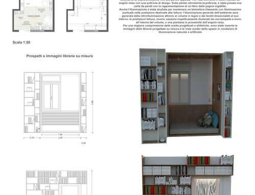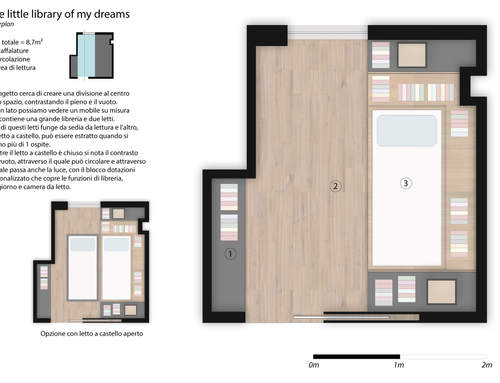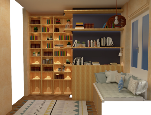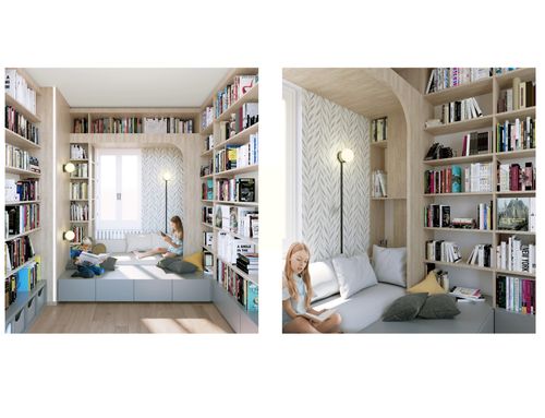 I'm fifty years old. I live in a house where there is a totally empty room left that I would like to use as a library and at the same time also have a bed inside as immersed in books but in an original way. In particular, I see it full of the colors of the book covers that also go around the window. and I would also like it to become a special place for my granddaughter who is now 8 years old and she had the idea of making a library